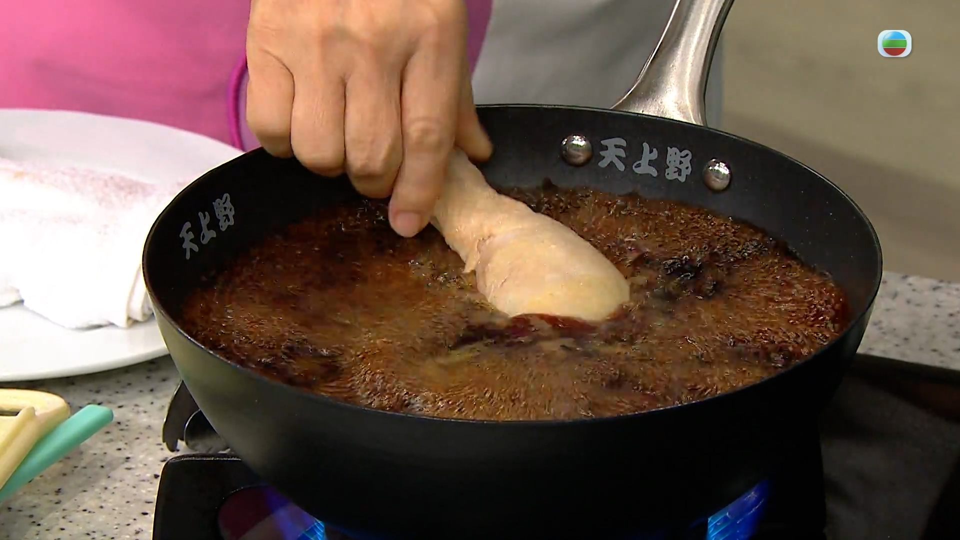 夏日炎炎,Annie師傅決定做一味冷盤,首先把雞髀汆水後放進以豉油和糖等配料混合而成的滷水汁煮25分鐘,在煮熟雞肉的同時帶來亮麗的顏色和豉油的鮮味。