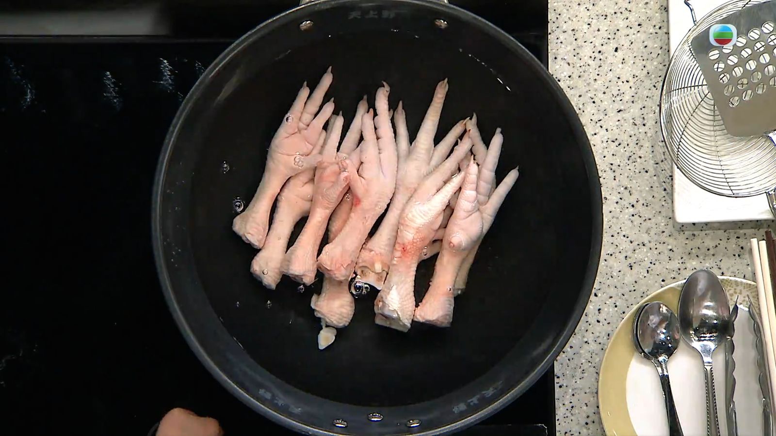 1.將雞腳洗淨,放進注入凍水的鑊中,開大火將水煮滾,隨即撈起雞腳轉浸冰水。