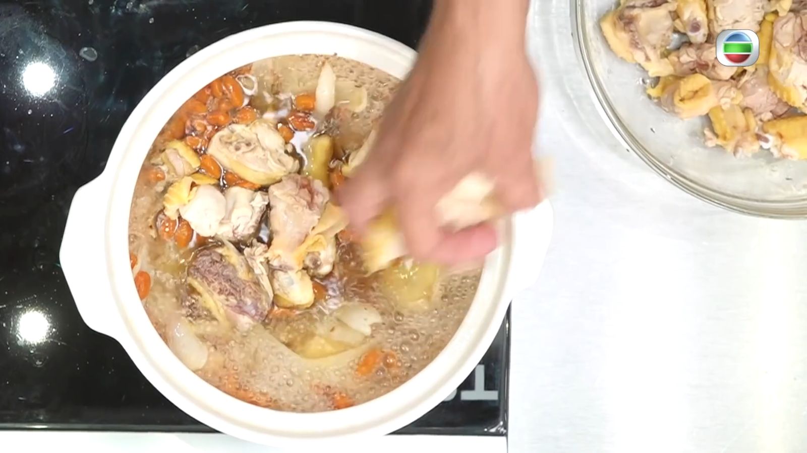 - 待湯水再次滾起時,加入已汆水的雞件。