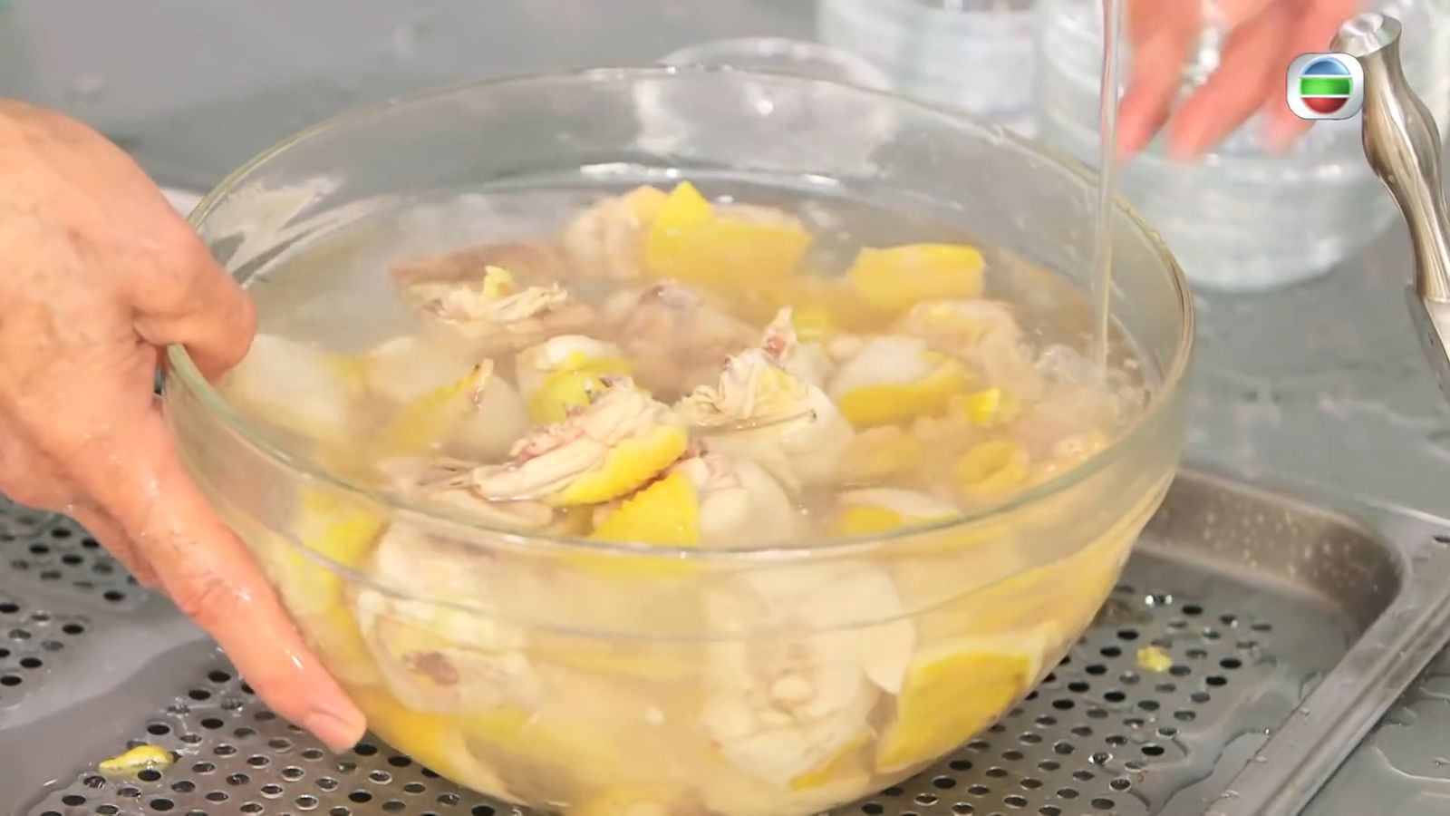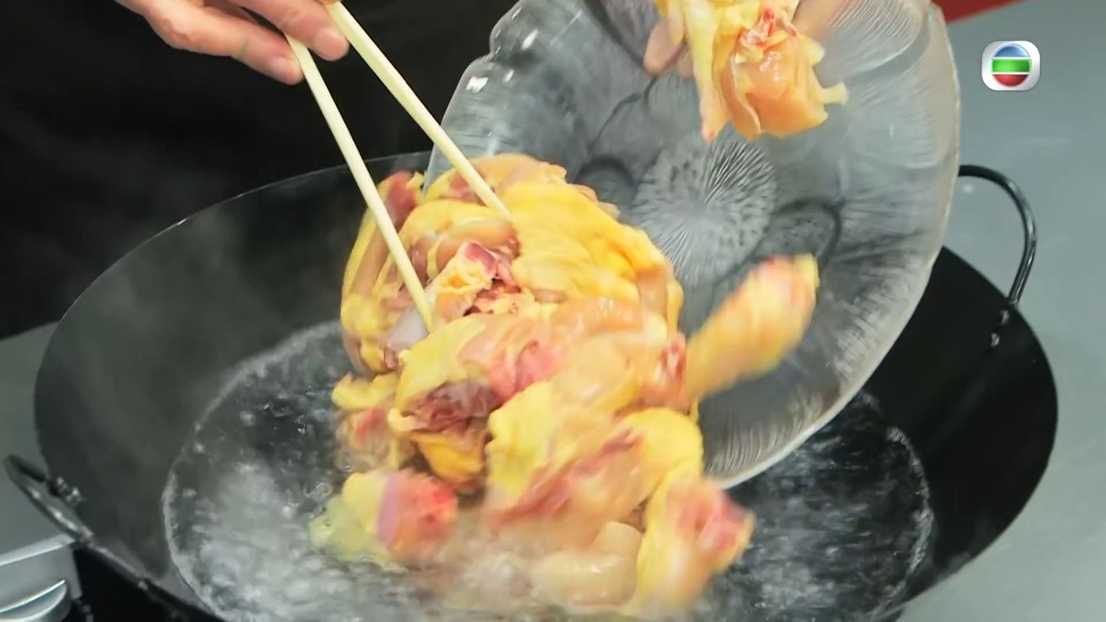 - 將雞件汆水,煮至肉質輕微收縮便可撈起,讓之後更易吸收藥材與酒香,再過冷河備用。