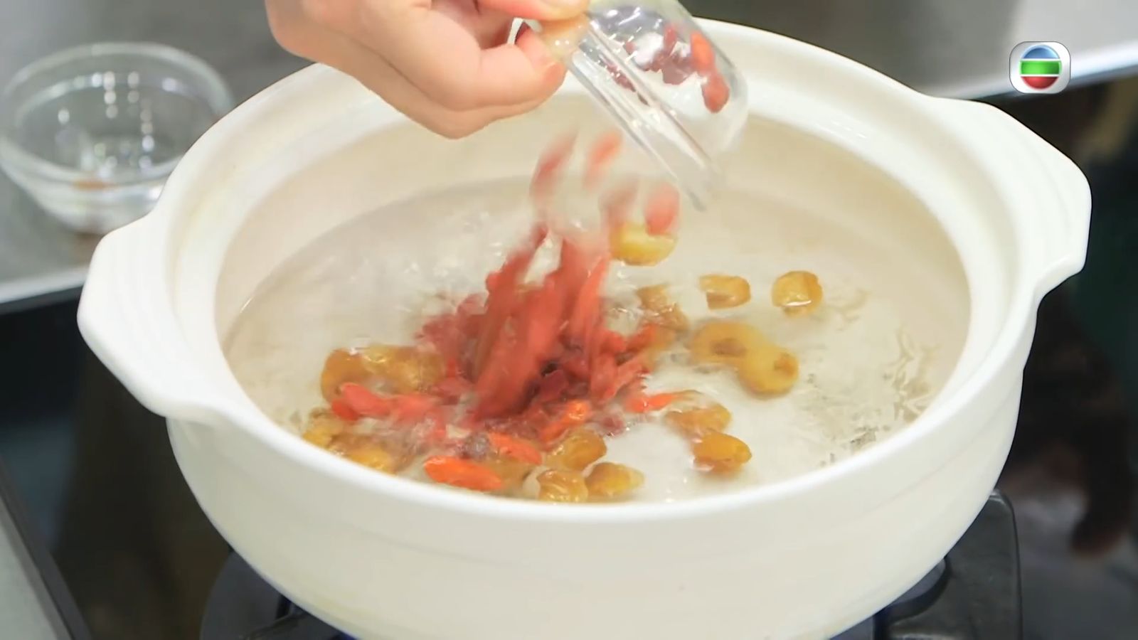 - 先將杞子、圓肉、玉竹及薑放入沸水中煮,直至玉竹變得透明、圓肉膨脹變大。