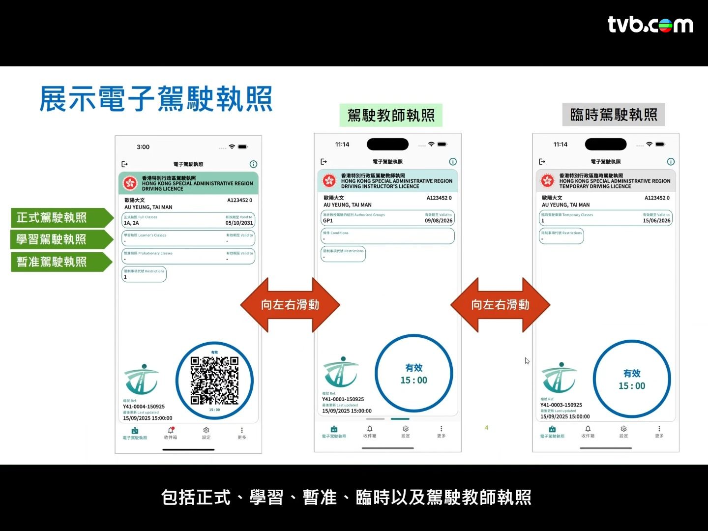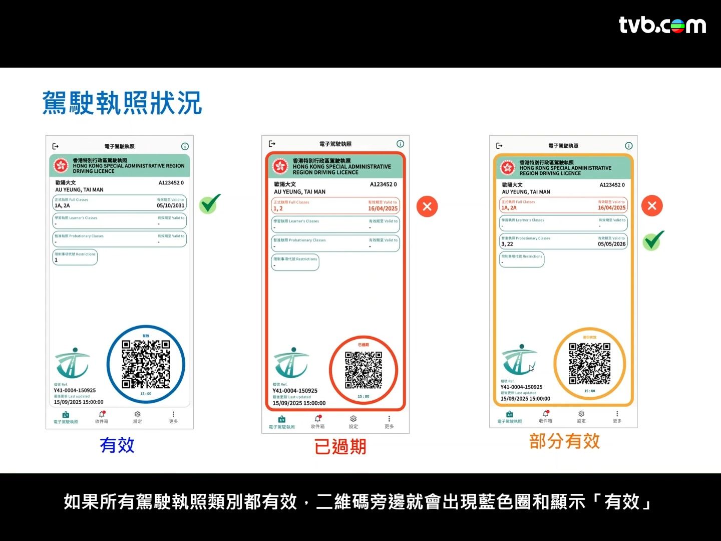 運輸署表示,電子駕駛執照所載資訊與實體版本一致,涵蓋持有人姓名、駕駛證號碼、准駕車輛類別及有效日期等,並會以藍色顯示有效、黃色代表部分有效(例如僅部分車種仍在有效期內),而紅色則顯示已過期。