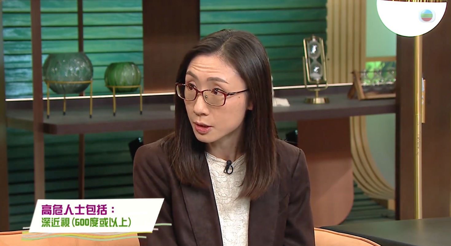 眼科專科醫生陳燕晴曾在《流行都市》中講解「青光眼」這種眼疾,她指患上青光眼人士的視野會收窄,嚴重者的中央視力受損,最後會導致失明。青光眼可以分為急性及慢性青光眼,或可分為開角性及閉角性。急性青光眼是眼壓在短時間內升高,病人會感受到眼睛疼痛、模糊、變紅,甚至出現頭痛情況!而慢性青光眼的眼壓會慢慢升高,早期病徵不明顯,以致患者並沒有發現自己患上慢性青光眼。