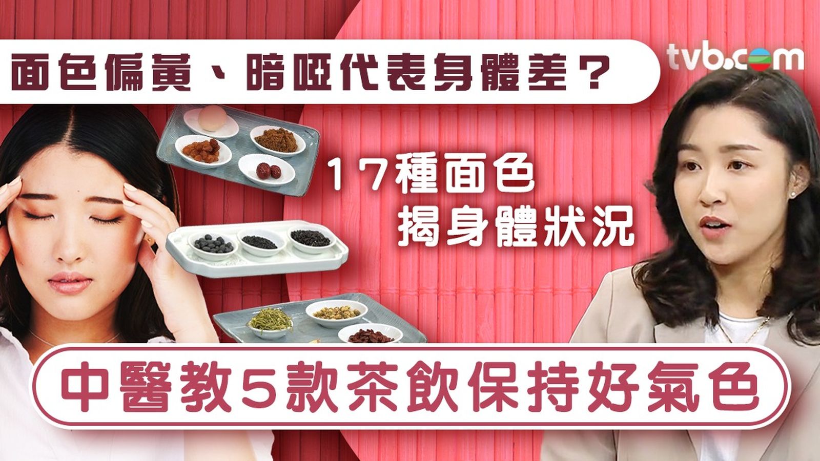 常常聽到「你面色很差」,面色反映了一個人的部分健康情況,你又懂不懂得看呢?是不是愈白愈好?如果面色偏黃,又反映了甚麼?《流行都市》邀請到中醫師來解釋不同面色分別反映甚麼狀況,又要服用甚麼茶飲才可以有健康面色!