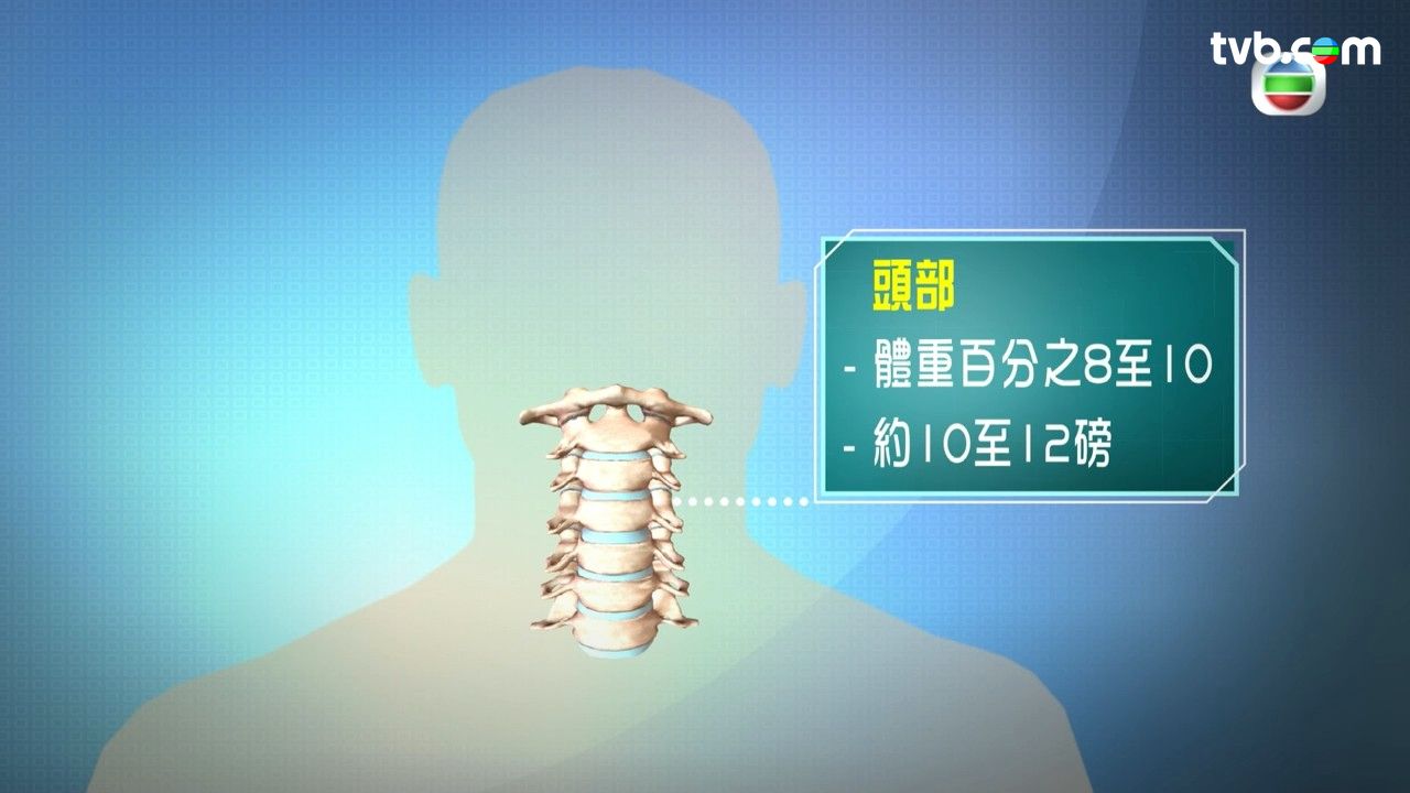 人的頸椎有支撐頭部的功能。以一般成年人為例,頭部重量大約佔體重 8% 至 10%,約 10 至 12 磅。當我們將頭部前傾,頸椎承受的重量會相應增加,如低頭前傾 60 度,頸椎承受的重量高達 60 磅,比一個小一學生還要重!所以長期低頭就會出現頸椎問題。