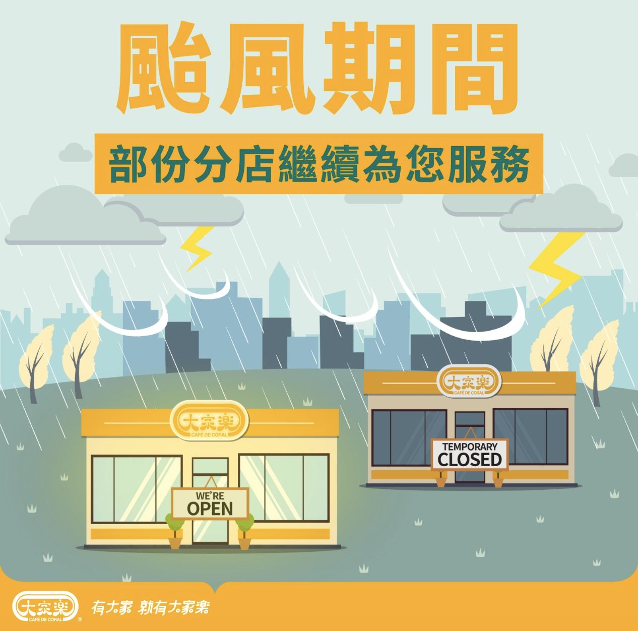 8號風球懸掛期間,部分大家樂分店仍然會於安全情況下繼續營業,可以在官方facebook上查詢仍然營業之分店。