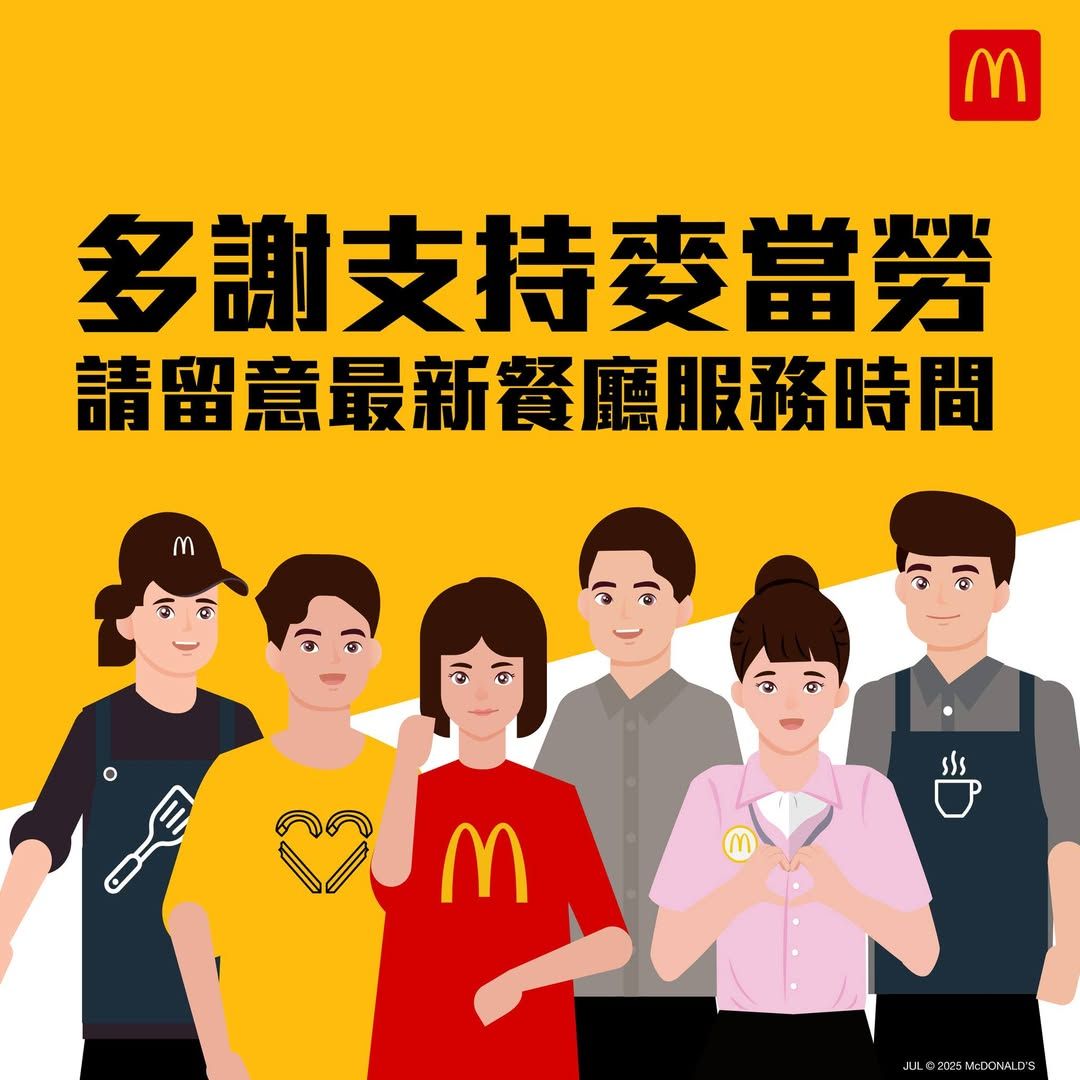 麥當勞在8號風球期間,部份餐廳會繼續為大家提供服務。堂食送餐服務會暫停,個別產品亦可能停售。最新服務安排參考官方Facebook。