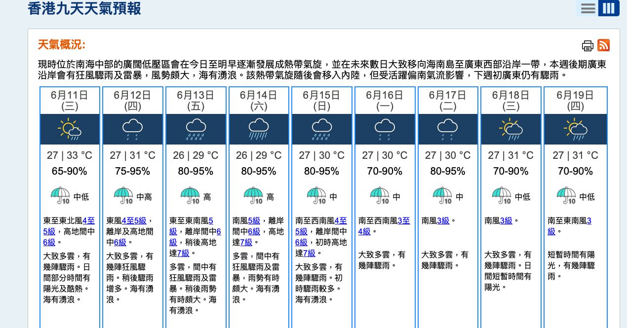 本港今明兩日持續酷熱。天文台下午錄得35.6度,連續兩日創出今年最高溫,平了有記錄以來六月份最高紀錄。流浮山更高達37.8度,打破1985年有紀錄以來的最高溫度。隨著該熱帶氣旋靠近,本周後期風勢頗大,間中有狂風驟雨,海有湧浪。建議市民遠離岸邊、盡量停止水上活動。![]()