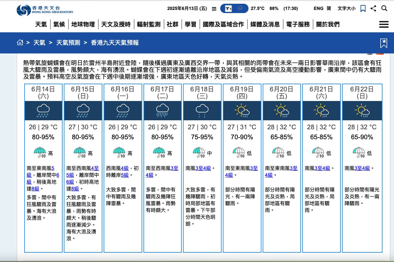 天文台九天天氣預報顯示,明日(14日)吹南至南風5級,離岸間中6級,稍後高地達8級。多雲,有幾陣狂風驟雨及雷暴,日間驟雨增多、雨勢有時頗大。海有大浪及湧浪。氣温介乎26至29度。![]()
