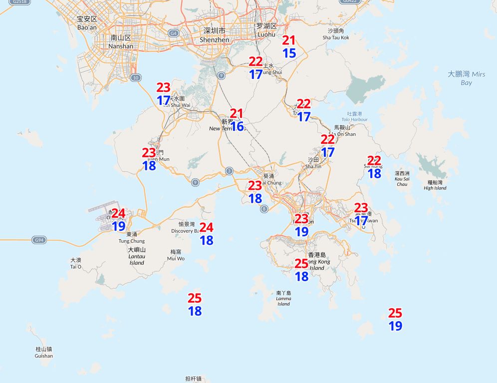 明日氣溫由午夜約23度,逐步下降至明晚市區最低約19度,新界再低兩三度。吹清勁至強風程度北風,離岸及高地間中吹烈風。海有大浪及湧浪。可以看到21日至23的分區最低氣溫為15度。