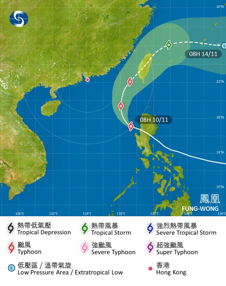 熱帶氣旋鳳凰已進入本港800公里範圍,天文台已在今日(11月10日)下午12時20分發出一號戒備信號。天文台指,按照現時預測, 鳳凰會在南海東北部逐漸轉向偏北方向移動,並在明晚至星期三(11月12日)初時最接近本港,於香港以東約400公里或以外掠過。天文台會視乎鳳凰的強度變化及與本港的距離、東北季候風對鳳凰的影響及本地風力,以評估是否需要改發三號強風信號,或改發強烈季候風信號。