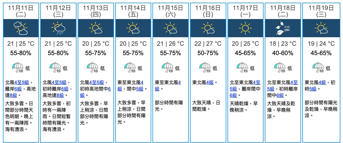 - 11月11日 (二) 21 | 25 °C :北風4至5級,離岸6級,高地達8級。 大致多雲。日間部分時間天色明朗。晚上有一兩陣雨。海有湧浪。