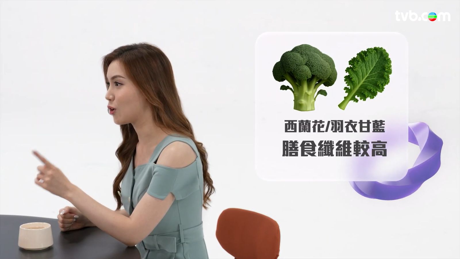 宋宛穎提到蔬菜中以西蘭花和羽衣甘藍和膳食纖維較高,含量是娃娃菜、椰菜、生菜這類相對低膳食纖維蔬菜的6倍。![]()