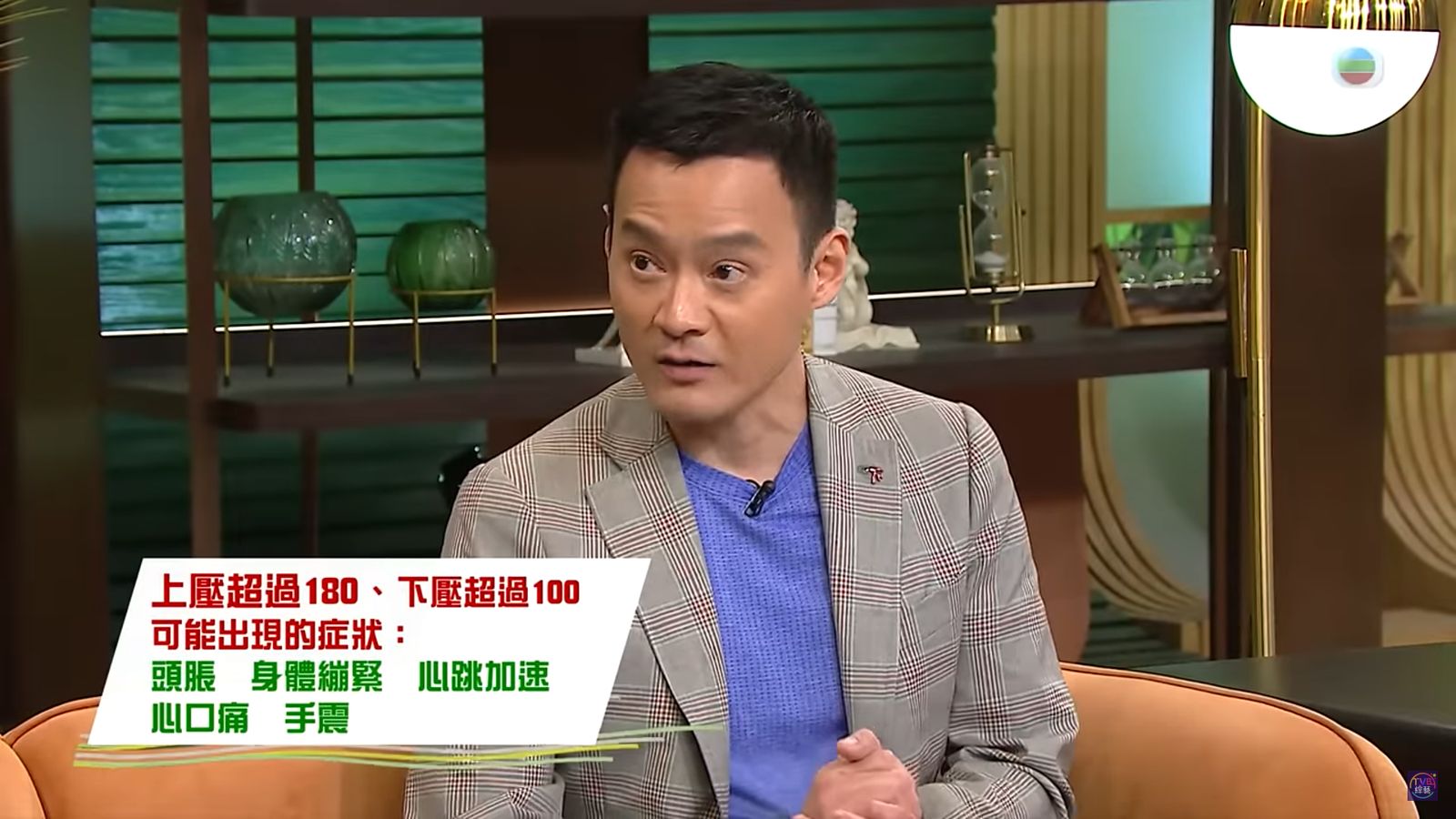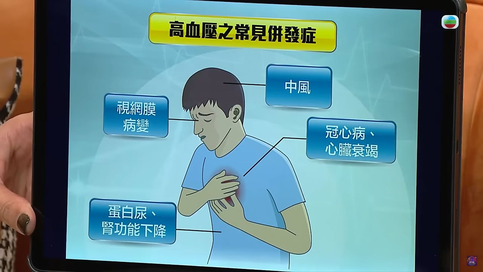 陳醫生介紹,當上壓超過180、下壓超過100,可能出現的症狀有:頭脹、身體繃緊、心跳加速、心口痛、手震等。![]()