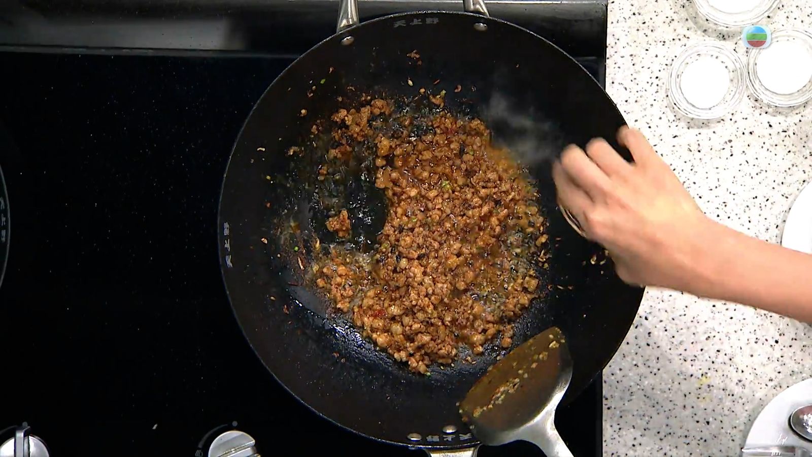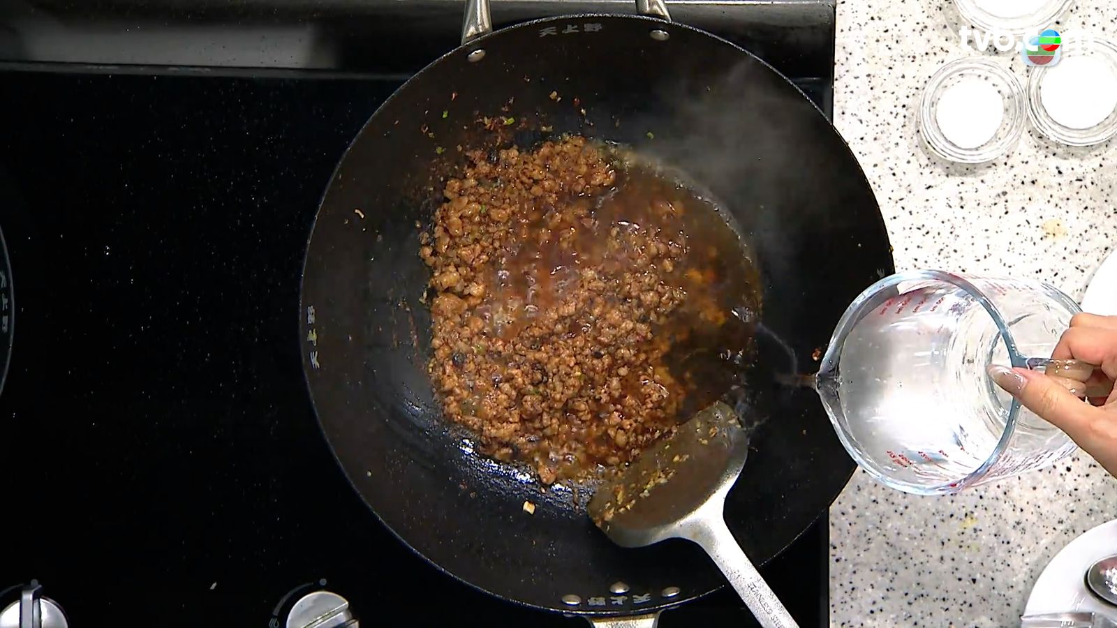 加水燜煮5至10分鐘,之後加入生抽、砂糖、鹽調味,最後下生粉芡煮稠成麻婆醬備用。