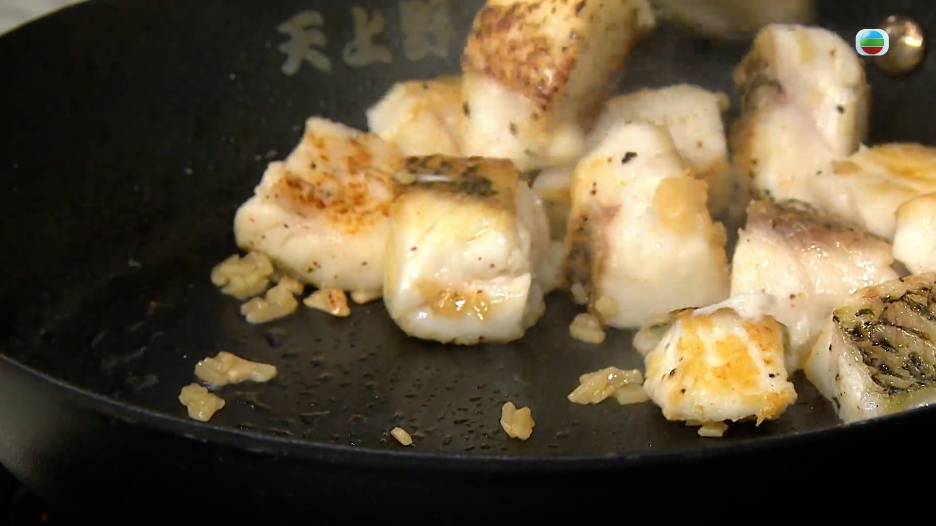 魚肉事先切粒醃製,與蒜蓉、黑胡椒一起煎香煎熟,最後鋪在湯汁上即成。