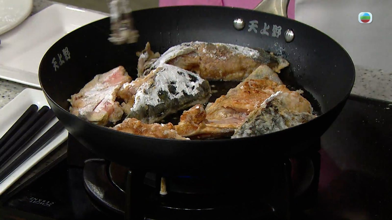 4.魚頭拍上生粉,放入原鍋中煎至金黃,取出。