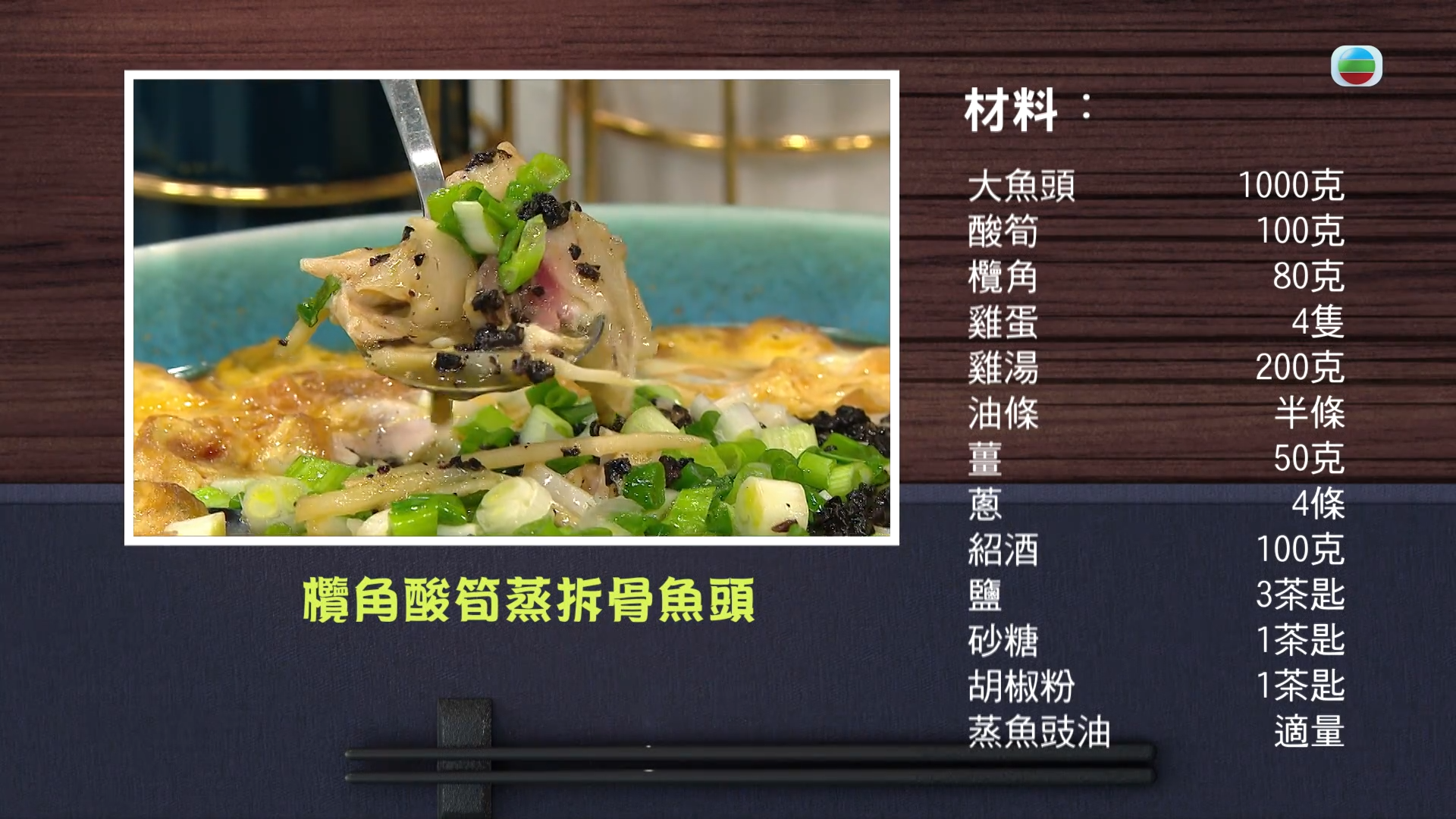 今集《流行都市》「睇餸食飯」環節有 李文星 教大家整「欖角酸筍蒸拆骨魚頭」!
