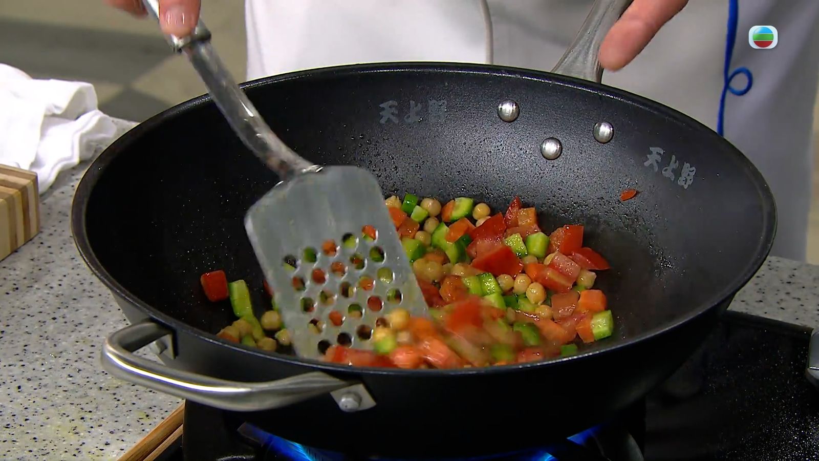起油鍋下甘筍粒炒香,下蕃茄炒出水份,再下青瓜,鷹嘴豆和鹽略炒備用。