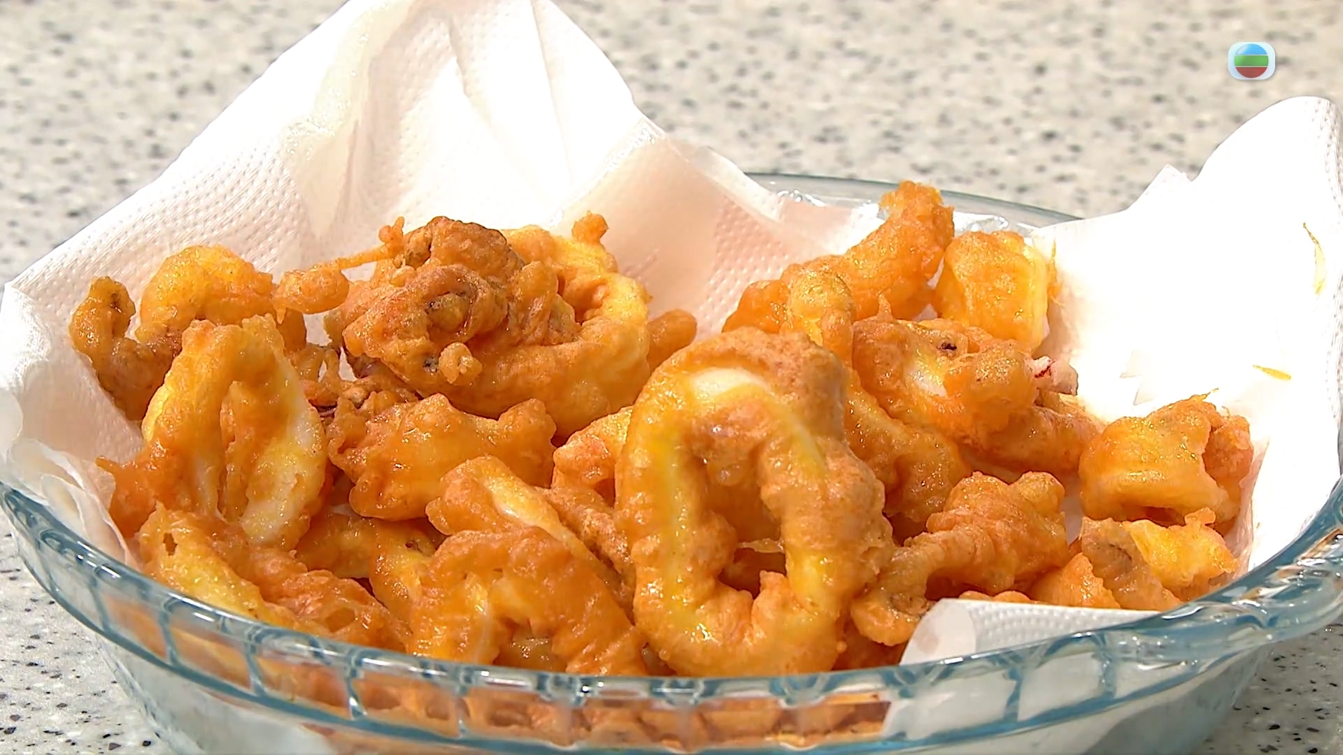 2.炸漿材料拌勻,鮮魷沾上炸漿,下油鍋炸至金黃香脆,撈起瀝油。
