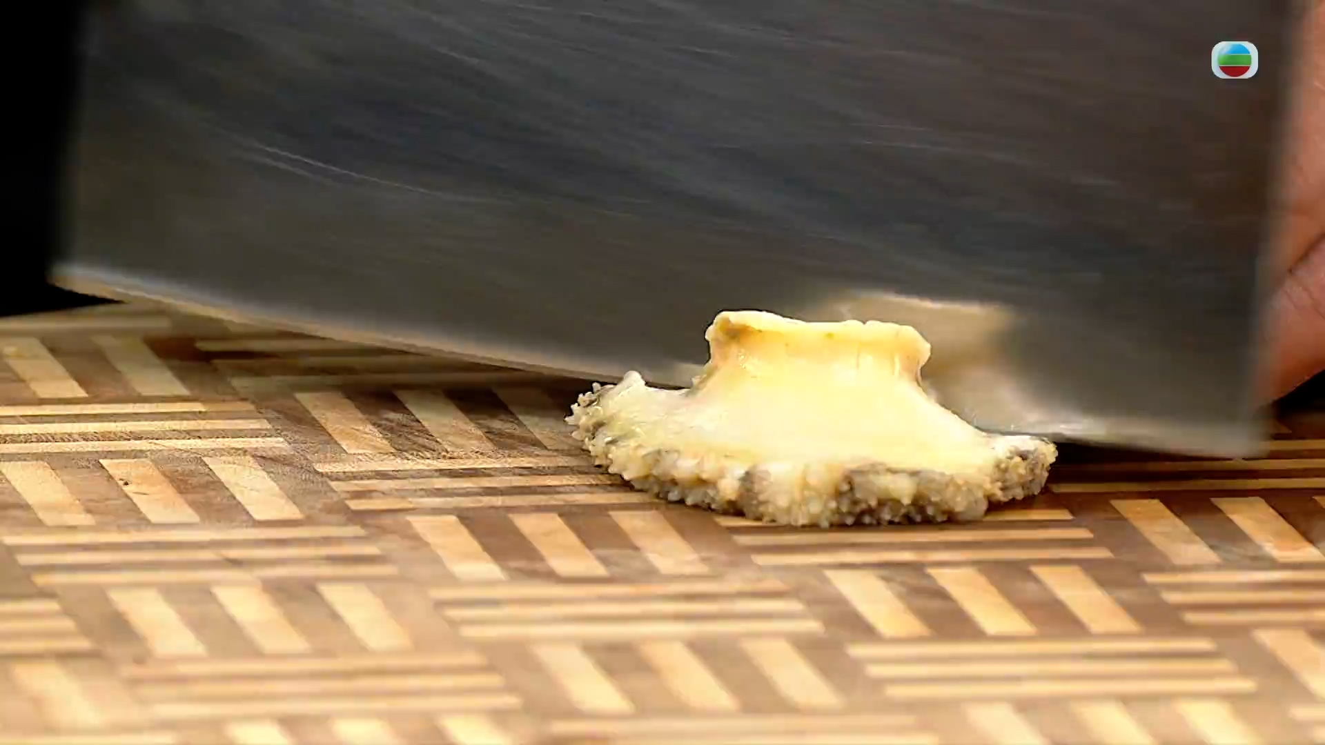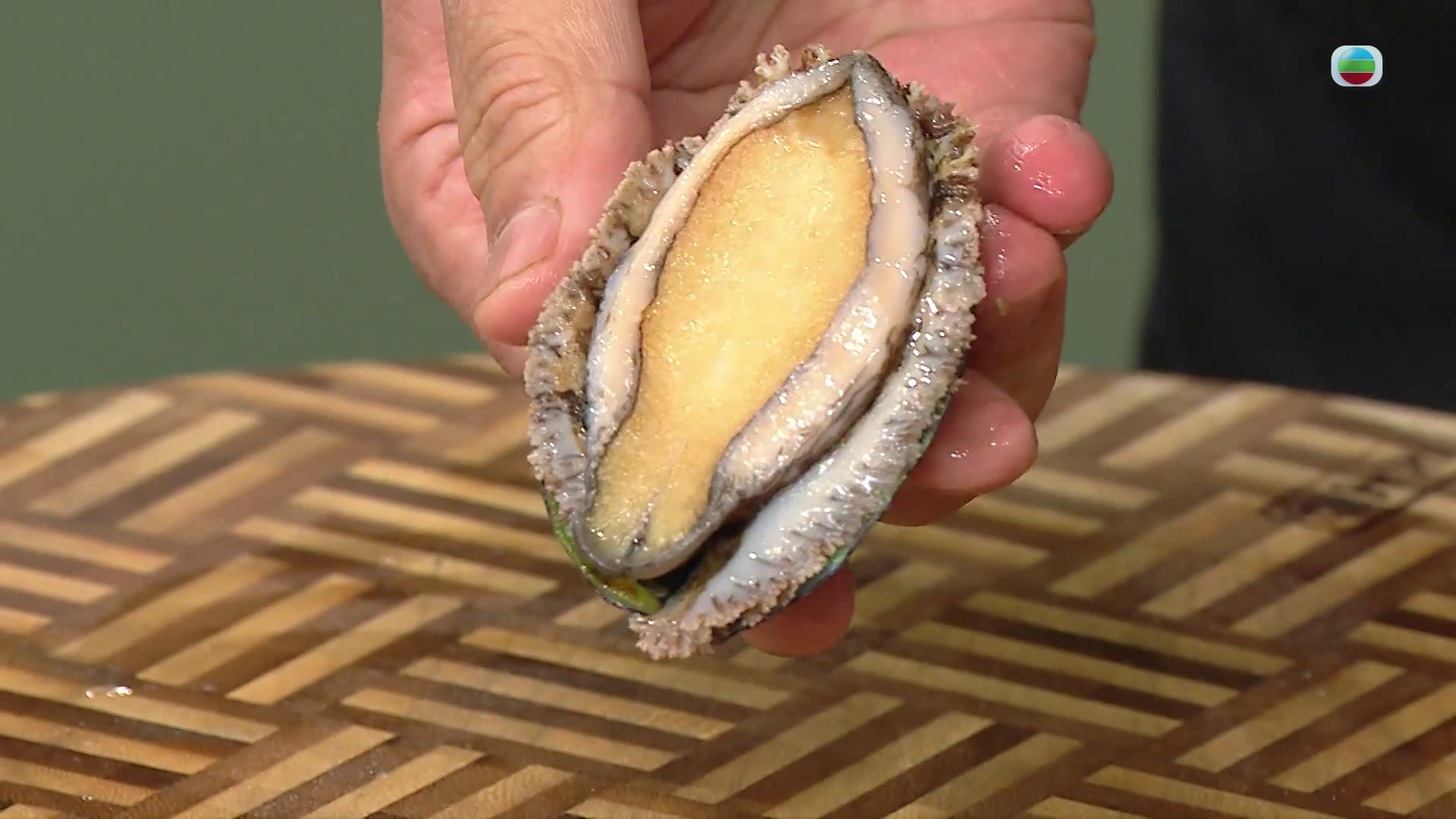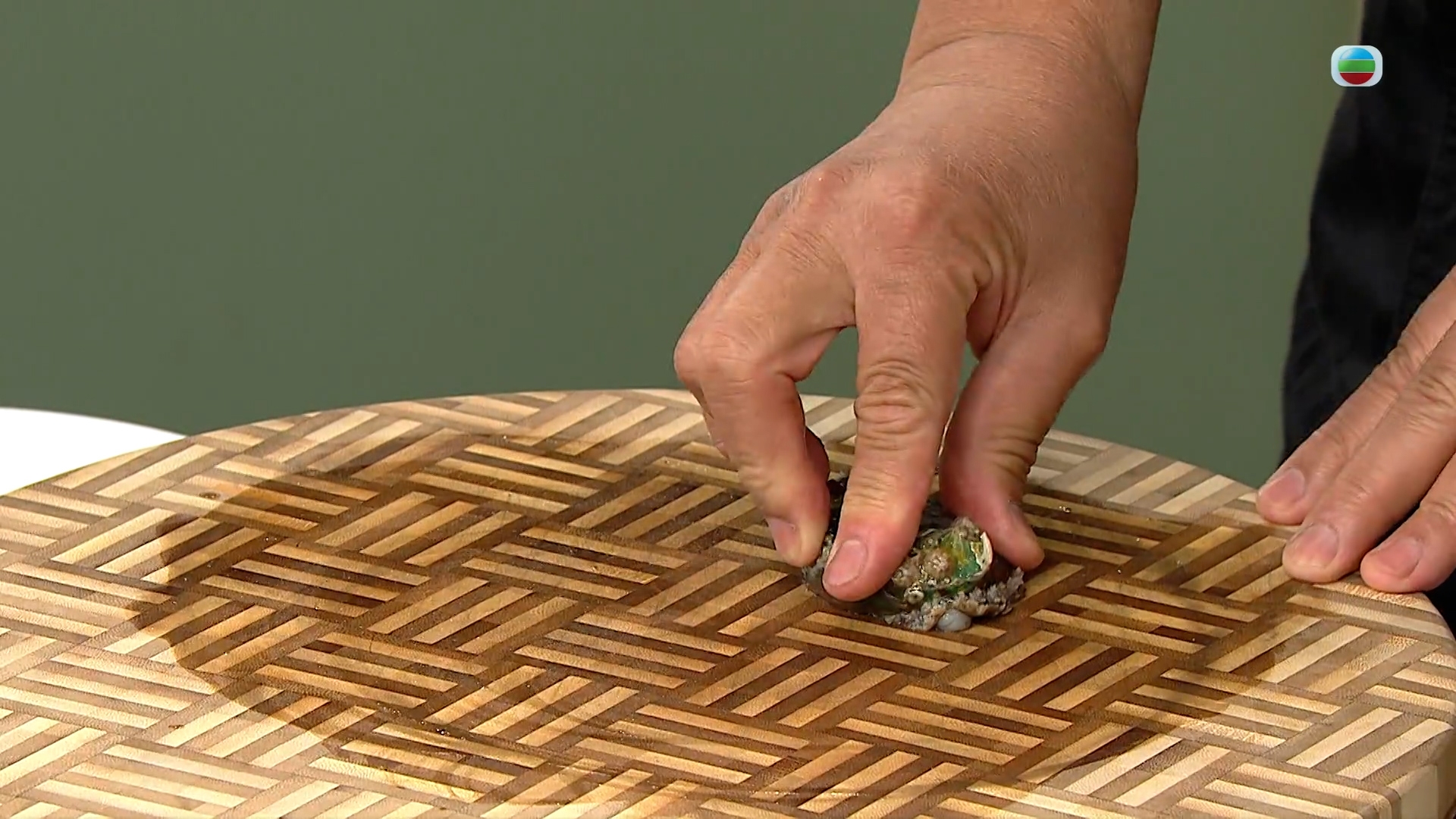 而買新鮮鮑魚最令人困擾的地方是要用牙刷將鮑魚逐只刷乾淨,不過文星師傅在這裡就傳授一個酒樓廚師常用的手法:直接把鮑魚按在砧板上擦,利用砧板粗糙的表面將鮑魚表面的黏液和污垢刷走,從圖中可見用砧板刷鮑魚可謂立竿見影。