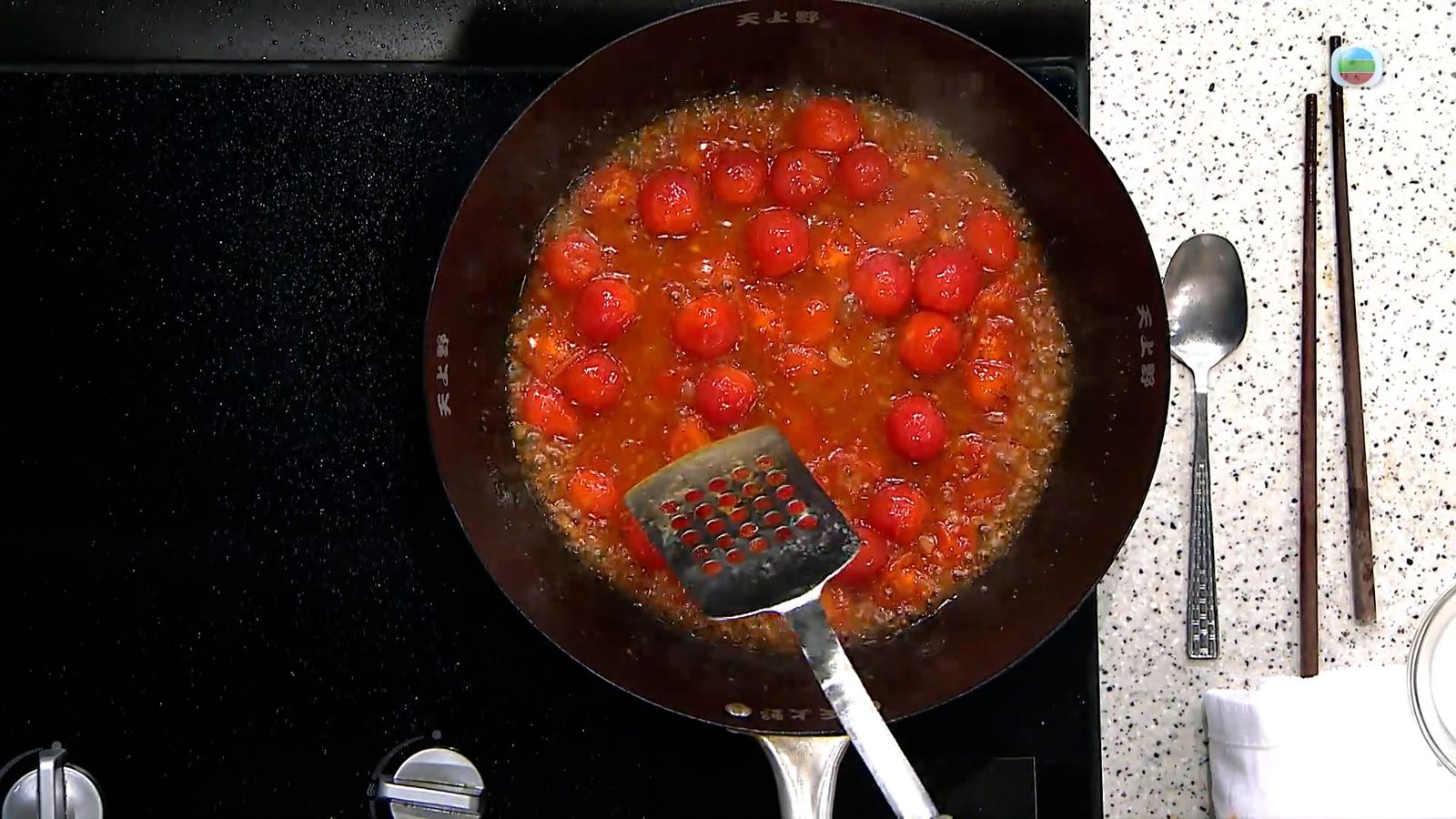 車厘茄滾水煮20秒去皮備用。將茄汁、生抽、糖、水,與部份車厘茄在鍋裡慢火煮成醬汁,再把餘下車厘茄加進去,再下生粉水調稠度。