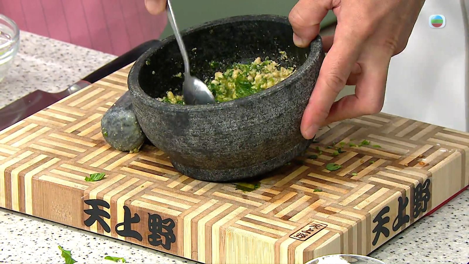 5.舂碎松子仁、羅勒葉,倒入橄欖油、鹽、檸檬汁,混成青醬。