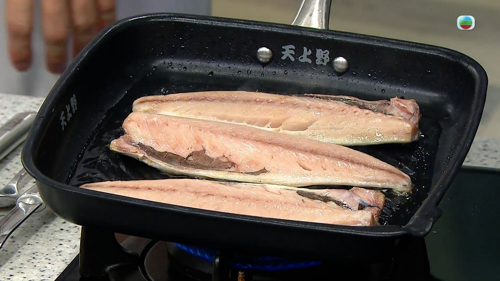 1.花鯖魚解凍、抹乾後,放入平底鑊煎香魚皮一邊,然後翻轉另一面繼續煎。