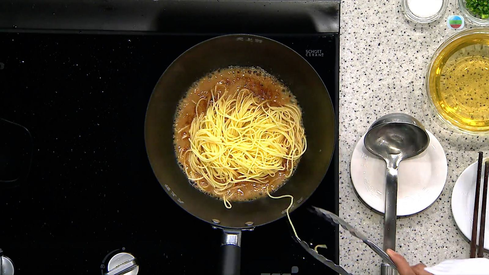 將意大利蛋麵放加鹽滾水灼熟備用。起熱鑊下牛油煮溶至微焦,剩下的半份西京醬拌入上湯後下鍋,加七味粉一起煮滾。再放入蛋麵拌煮至汁液濃即成。