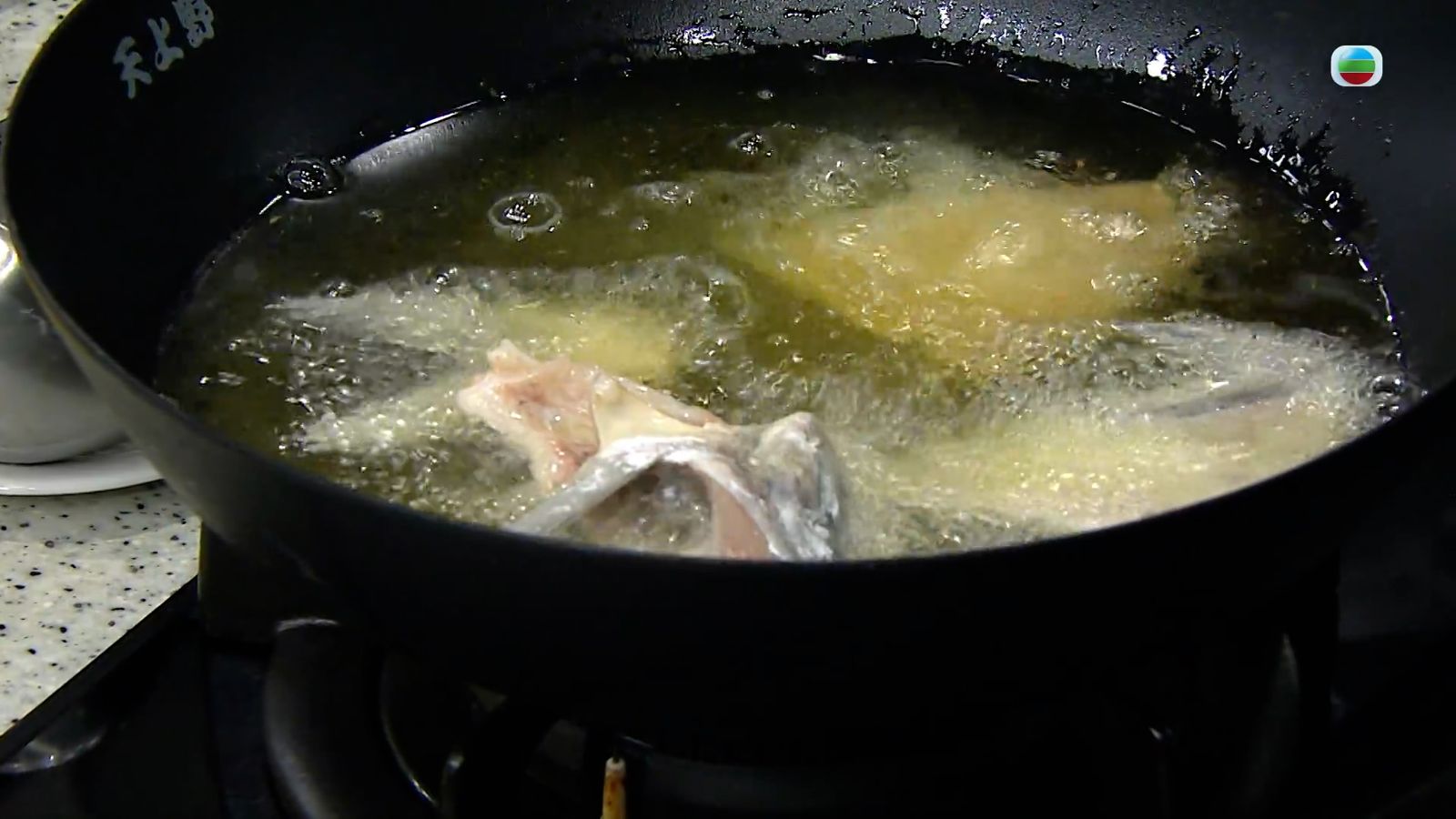 3.至於魚骨、魚頭則吸乾水分,滾上一層生粉,放入暖油內以中小火炸至酥脆,轉大火炸至金黃,就可撈起上碟。