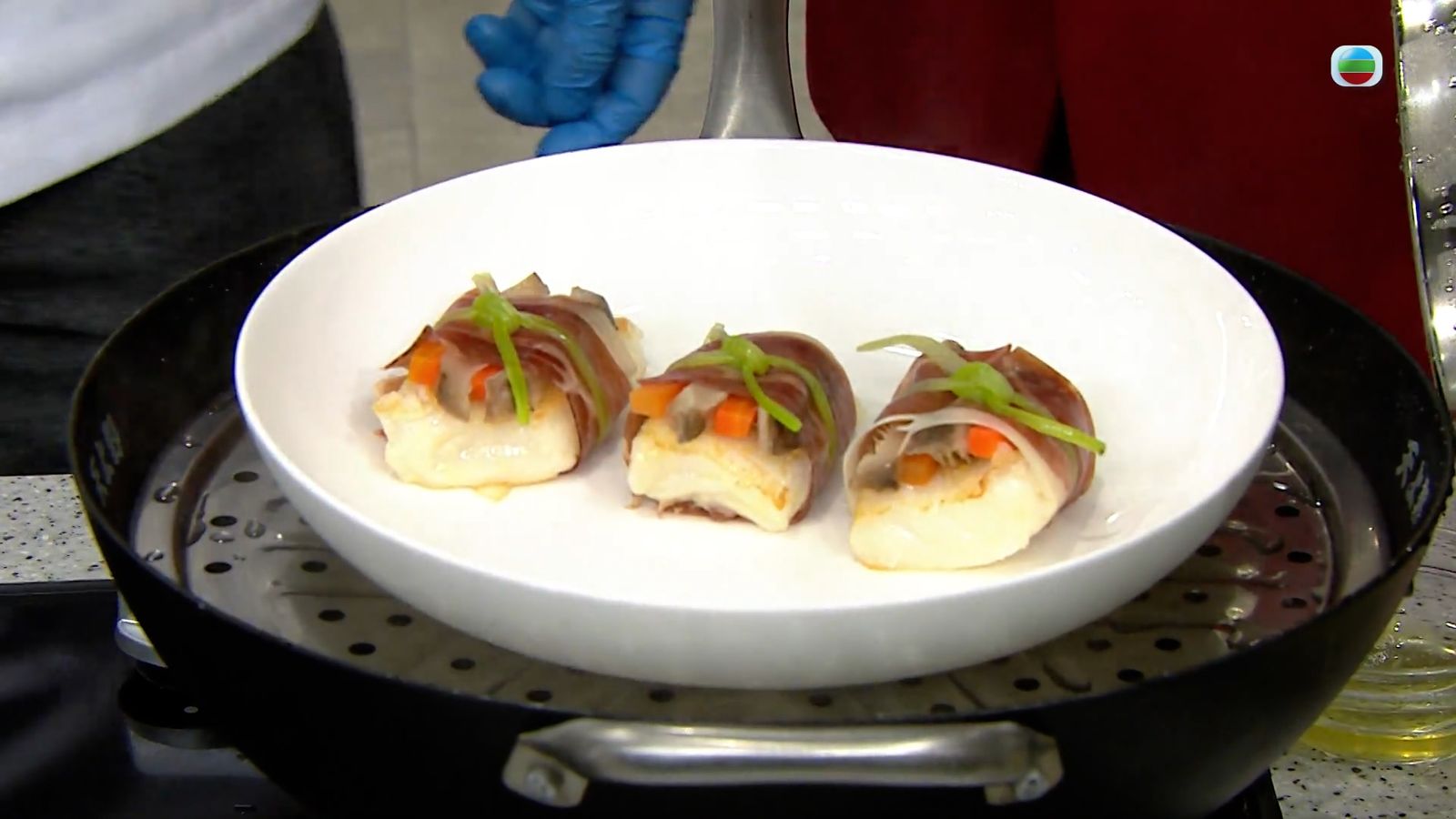 4.用巴馬火腿片包裹煎香的鱈魚件、甘筍條、冬菇條,再以唐芹絲紮好固定成火腿卷,下鍋蒸3至4分鐘,取出。