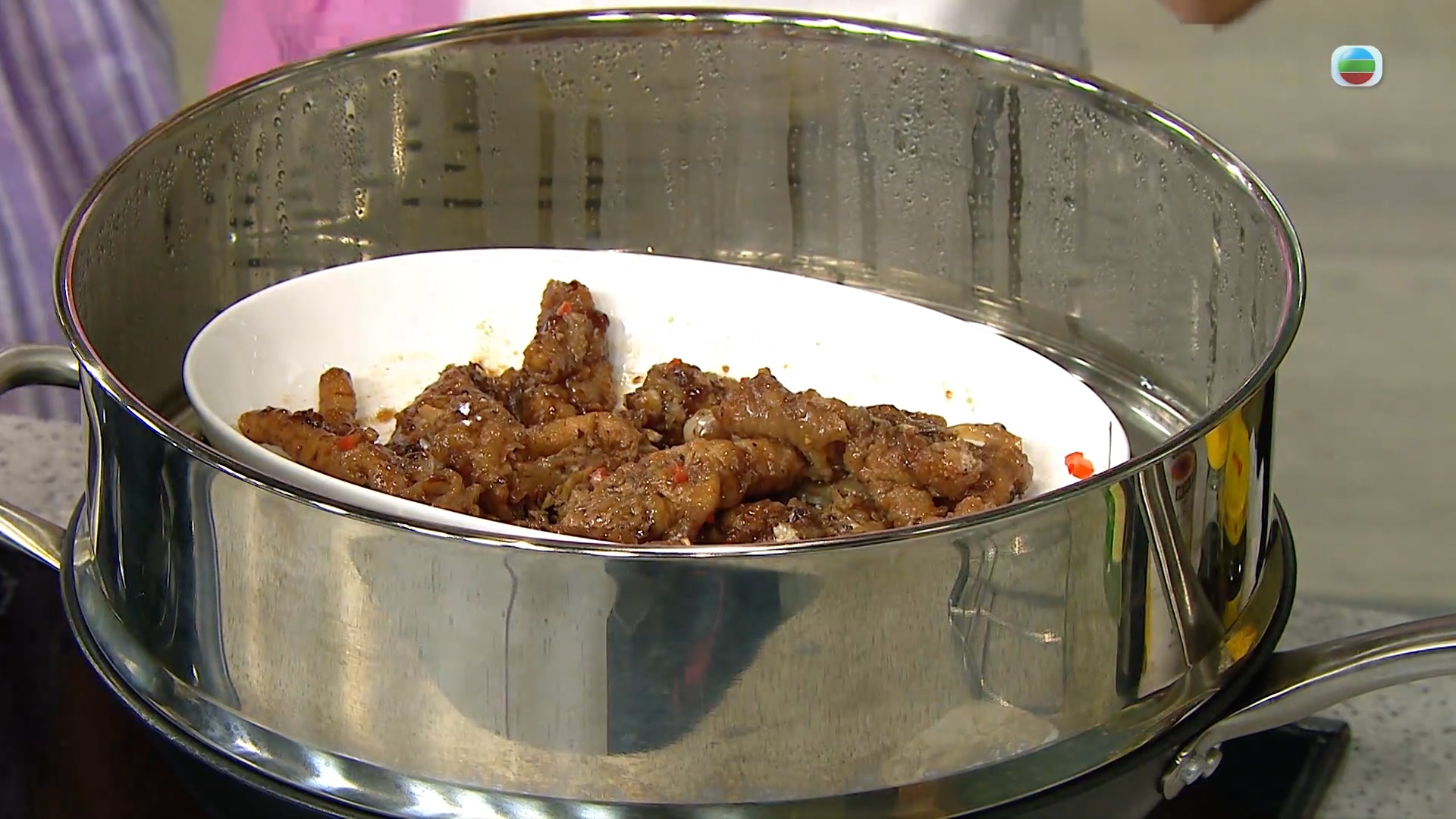 2.加入兩湯匙蒜蓉豆豉醬、蒜蓉、蠔油、生抽、麻油、糖。放入鳳爪攪拌均勻,醃兩小時,加生粉紅椒,蒸10分鐘以上。