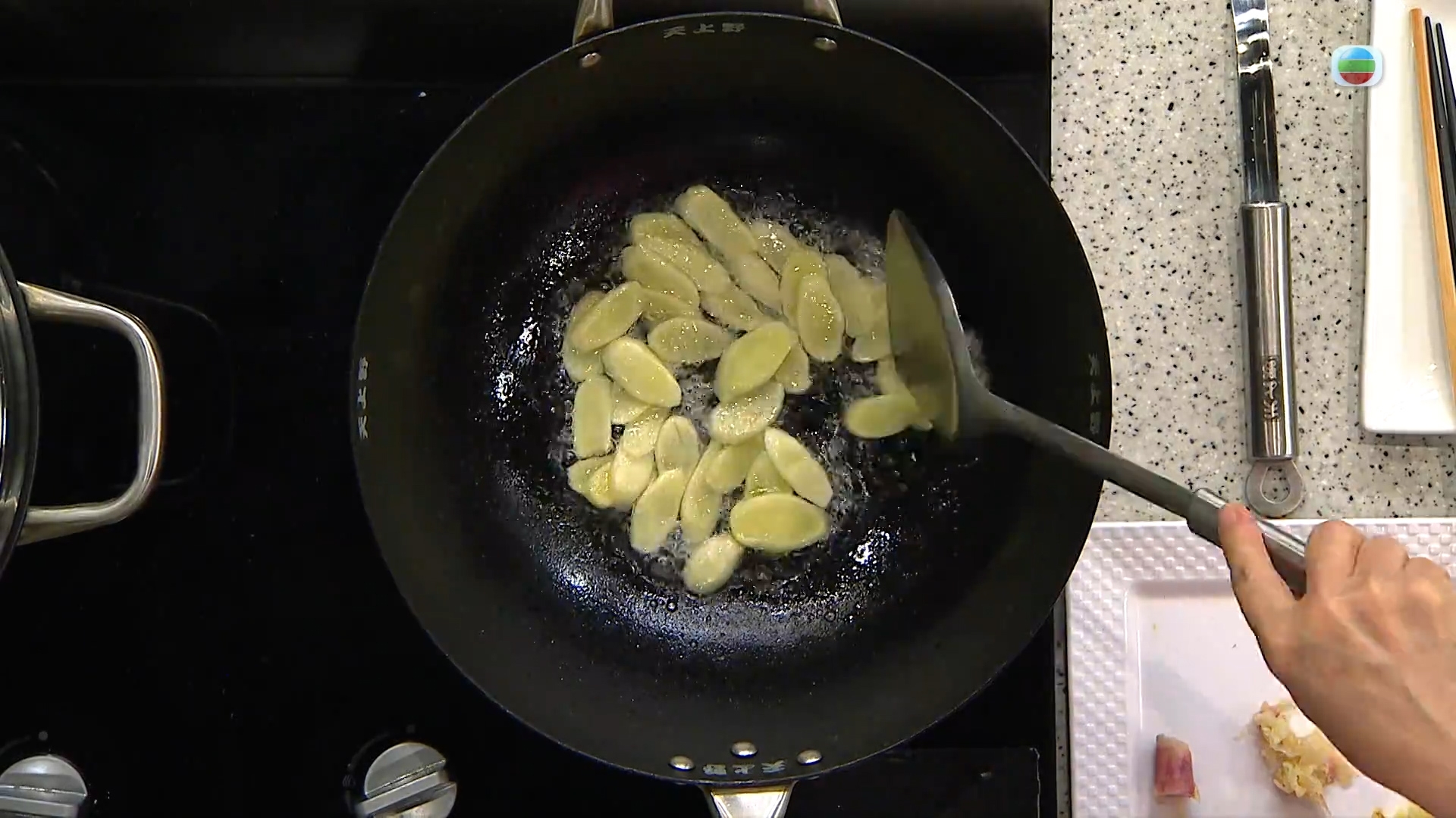 3.把子薑切片,加鹽醃15分鐘,子薑出水後把水倒出,再用紙巾包住扭出水。放入鑊炒,加入米醋、糖。