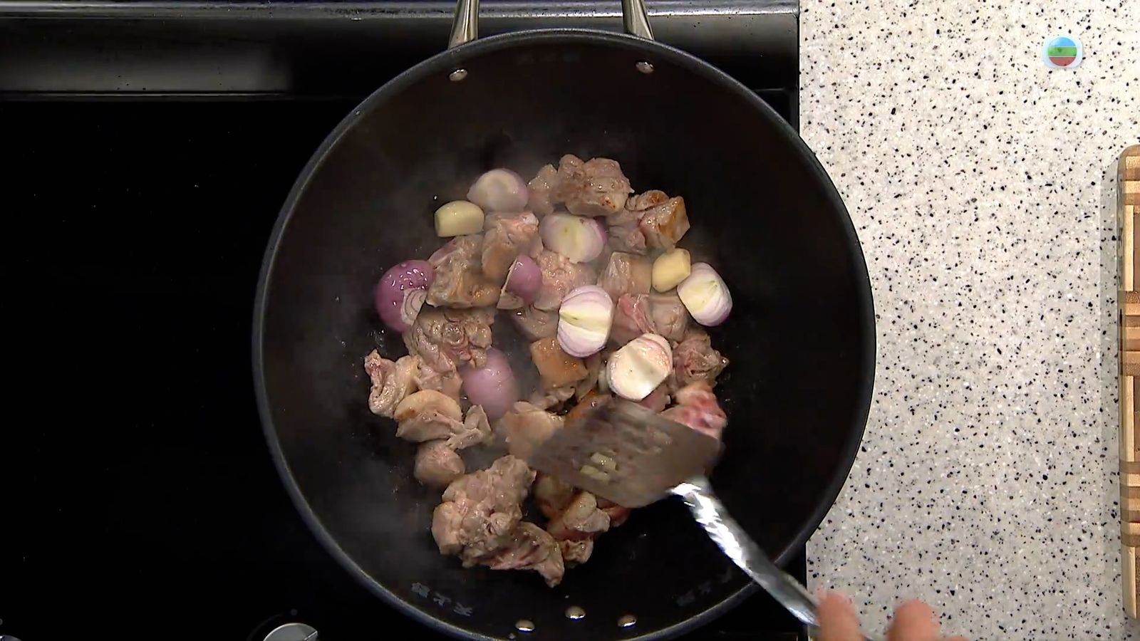 3.起油鍋,下鴨件煸香,加入乾蔥、蒜頭略炒。