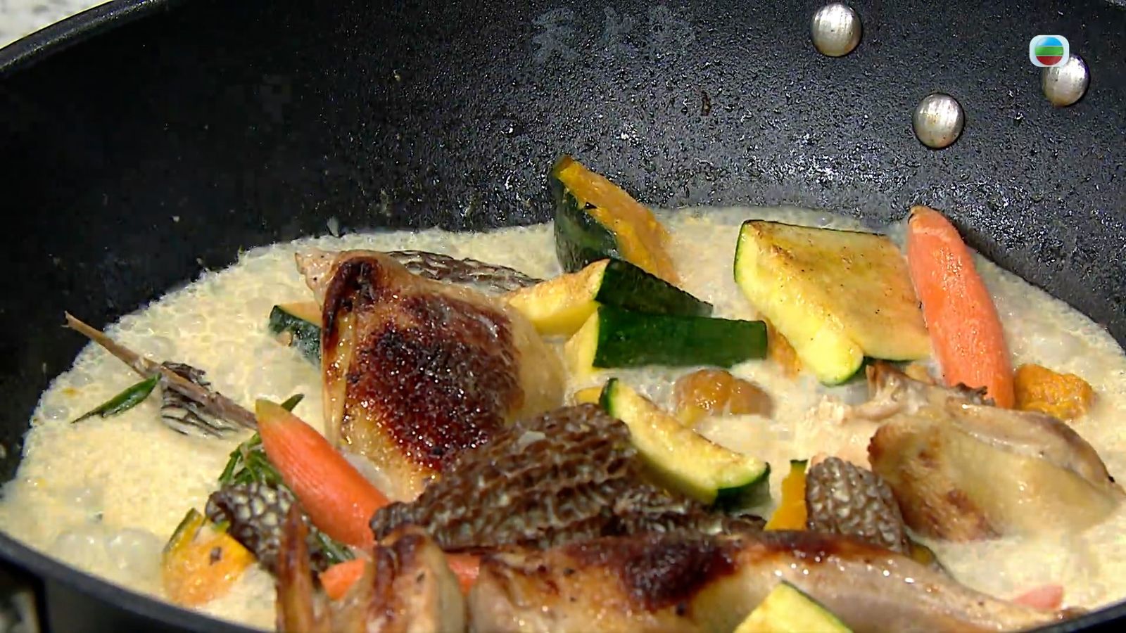 甘筍仔刨皮預先蒸5分鐘。南瓜肉切件,放入氣炸鍋以攝氏150度焗8分鐘。栗子連皮放入氣炸鍋以攝氏160度焗30分鐘後去殼。翠玉瓜煎至軟身。之後用乾蔥起鍋,先加白酒,再放入迷迭香、羊肚菌、甘筍仔及南瓜,最後倒入忌廉及半脂奶煮成醬汁。