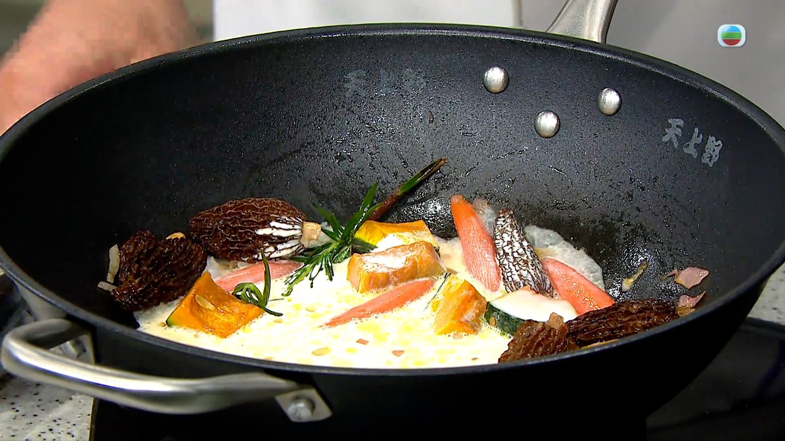5.另鍋以乾蔥起鑊,注入白酒,放入迷迭香、羊肚菌、甘筍仔及南瓜,倒入忌廉及半脂奶煮成汁。
