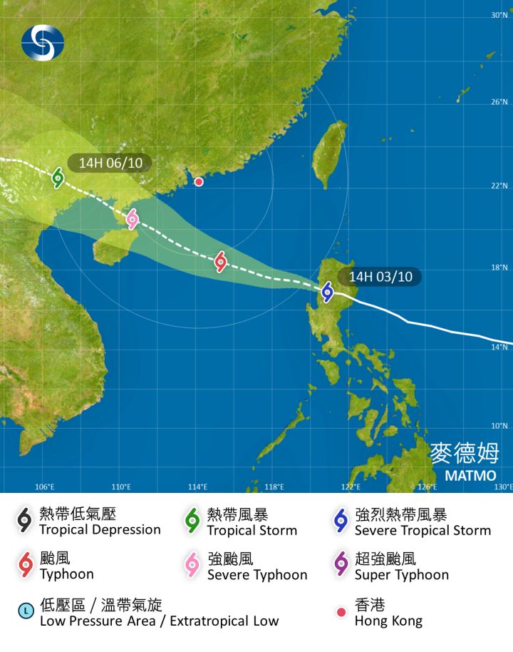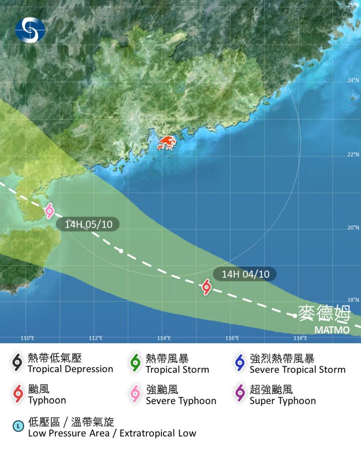 而根據天文台的熱帶氣旋位置及路徑圖預測,麥德姆在10月5日有機會以強颱風級別掠過香港。而看到天文台預測的風力,10月4日 (六) 東至東北風3級,稍後5至6級,離岸及高地間中8級;10月5日 (日)東至東南風5至6級,初時離岸及高地間中8級。