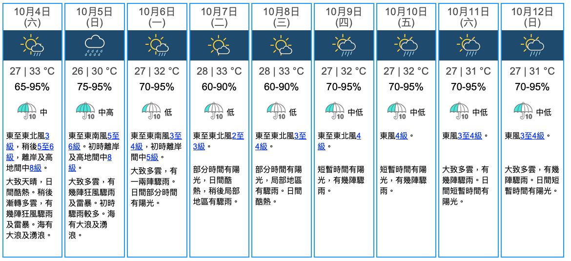 - 10月10日 (27 | 32 °C) :東風4級。 短暫時間有陽光,有幾陣驟雨。