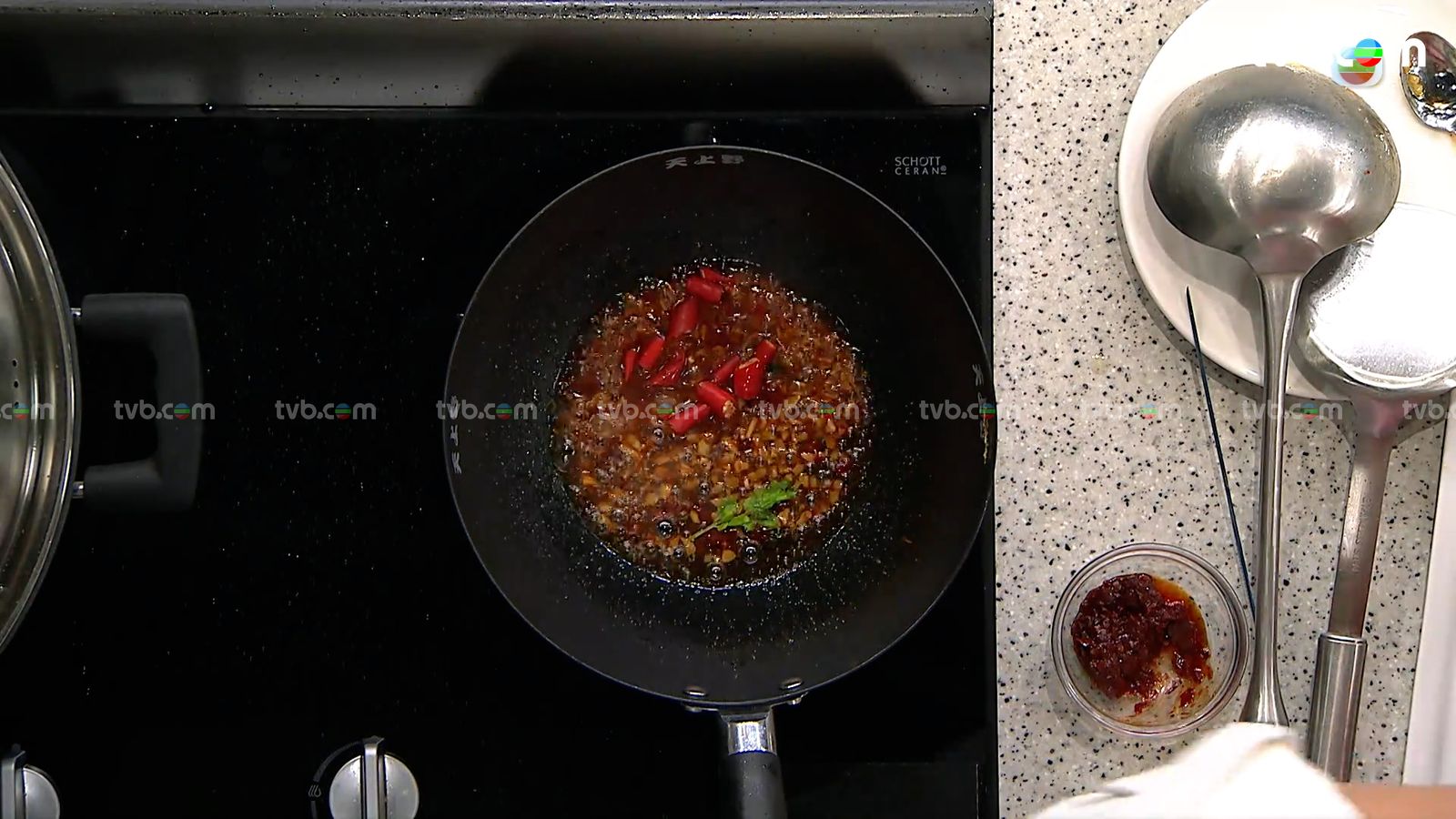 另起油鍋爆香花椒,撈出花椒後原鍋下蒜蓉、豆瓣醬、豉油、清水煮勻,再按個人喜好加入辣椒絲煮成醬汁。