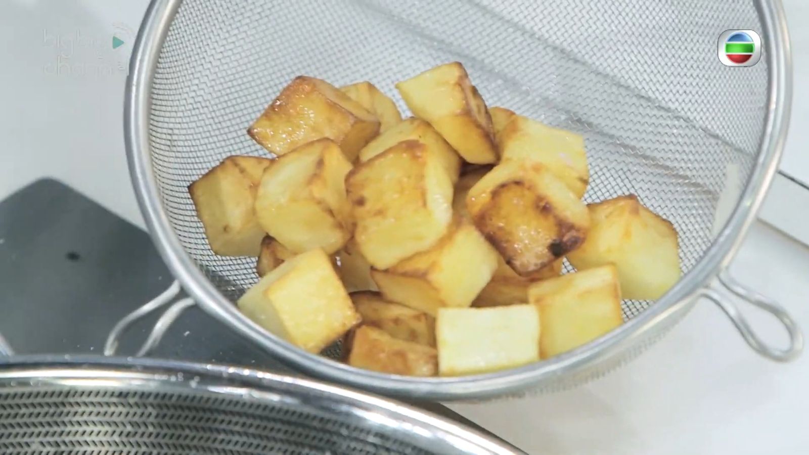 - 將薯仔粒拌入鴨油,以少量鹽及胡椒調味,放入燒熱油鑊半煎半炸至表面金黃,撈起備用。
