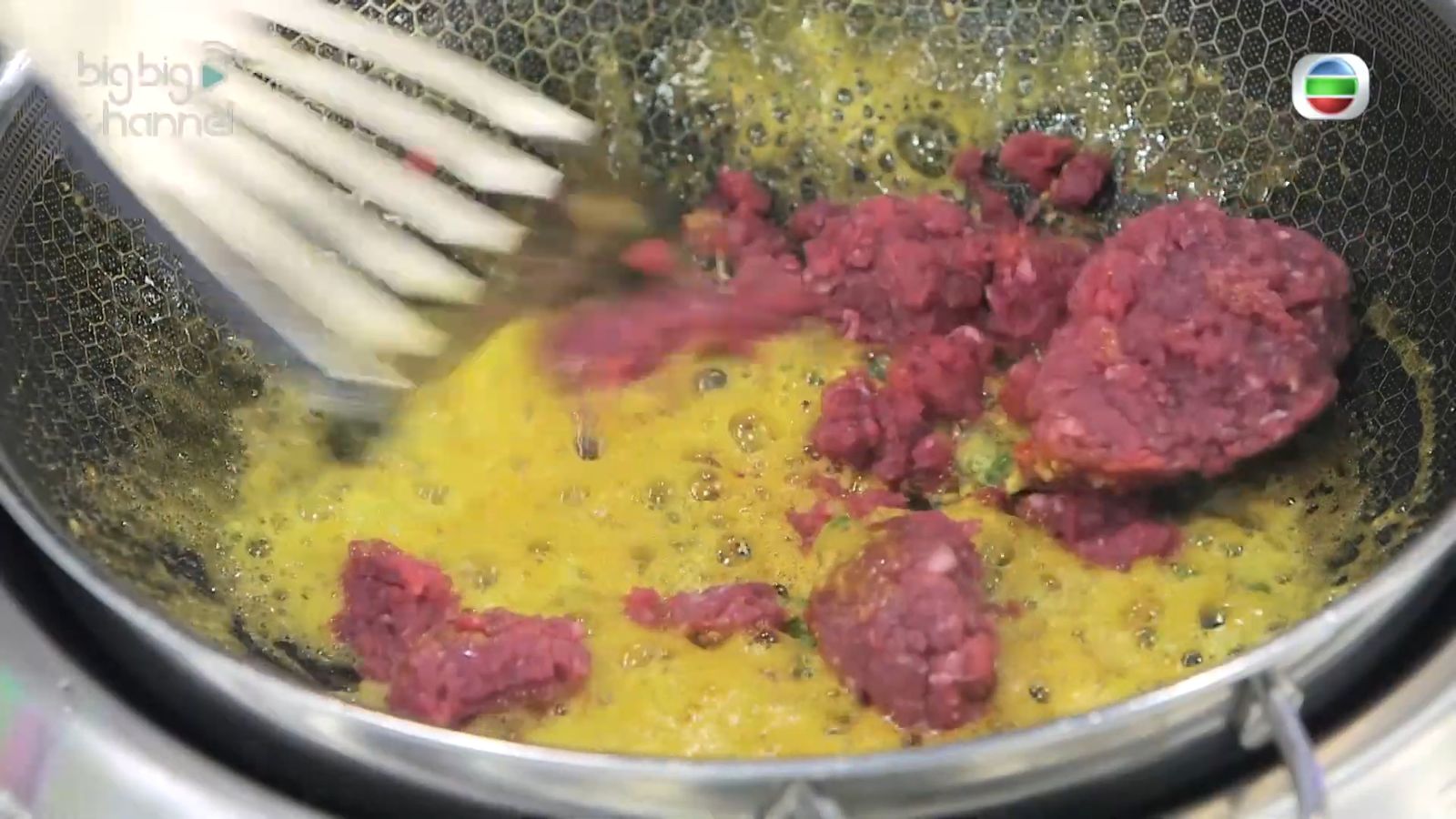 - 沿用同一隻鑊,快炒豆角粒、乾蔥及蒜粒,加入黃薑粉炒香,倒入免治牛肉炒散,再以少許鹽及菇粉調味,盛起鋪碟。