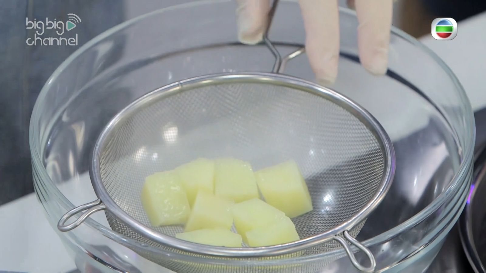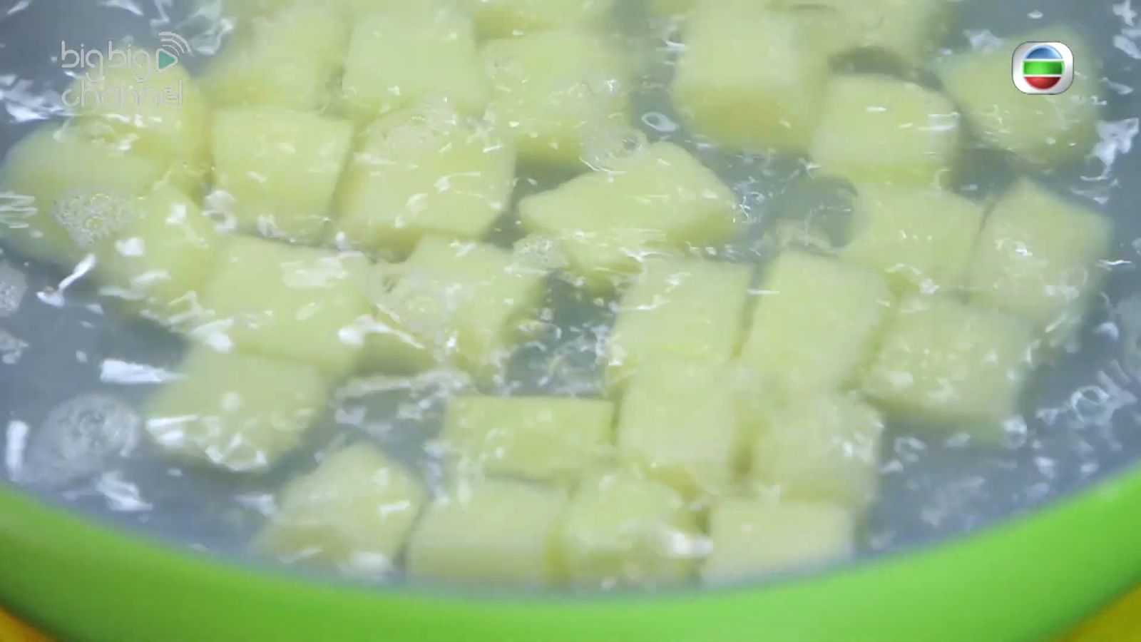 - 馬鈴薯去皮沖洗,切成約 1.5 厘米見方的小塊,放入水中汆煮至半熟,瀝乾備用。