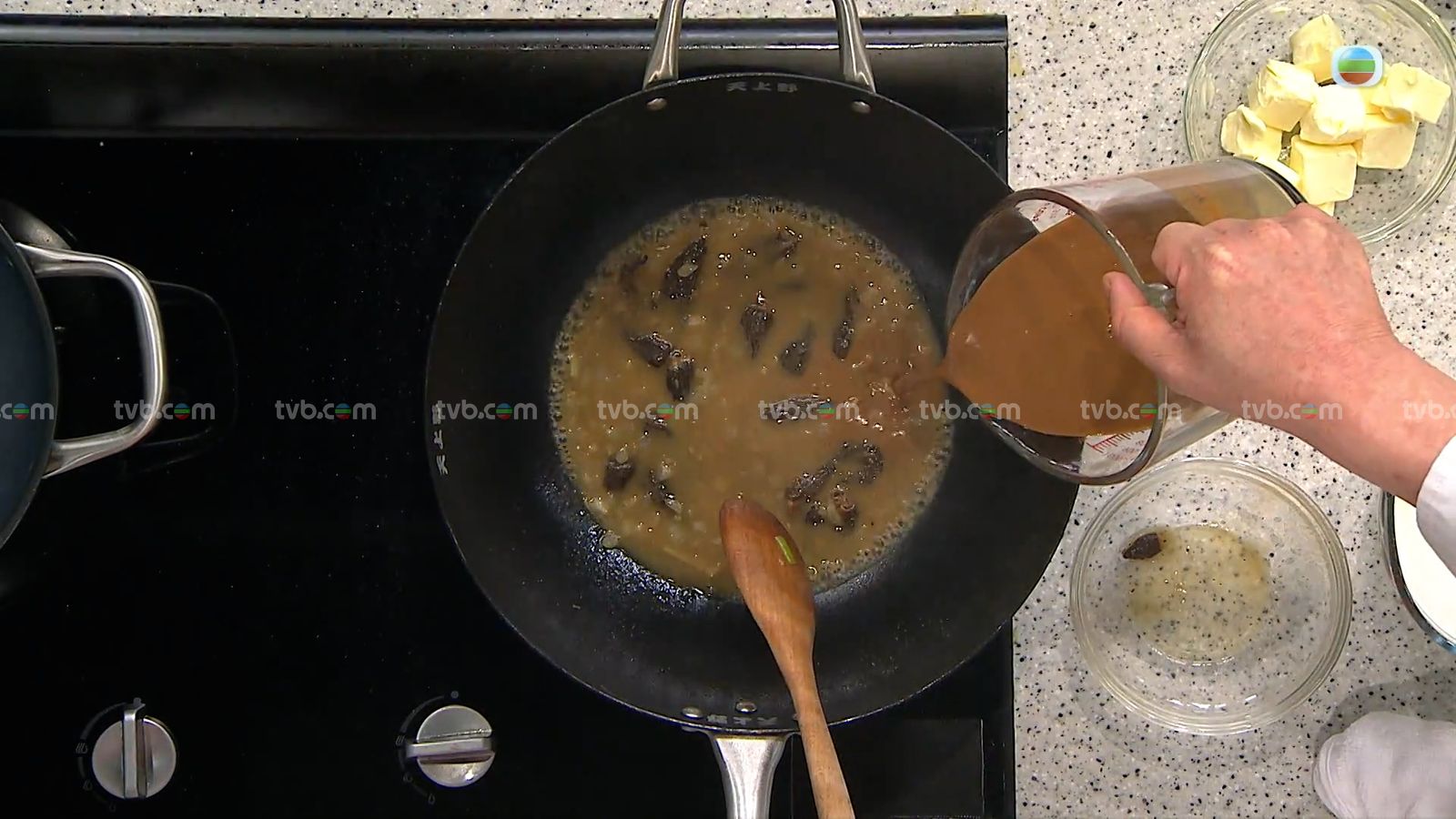 7.用牛油起鍋,下龍蝦鉗肉碎炒香,取出置於羊肚菌鍋中,拌勻成醬汁,備用。