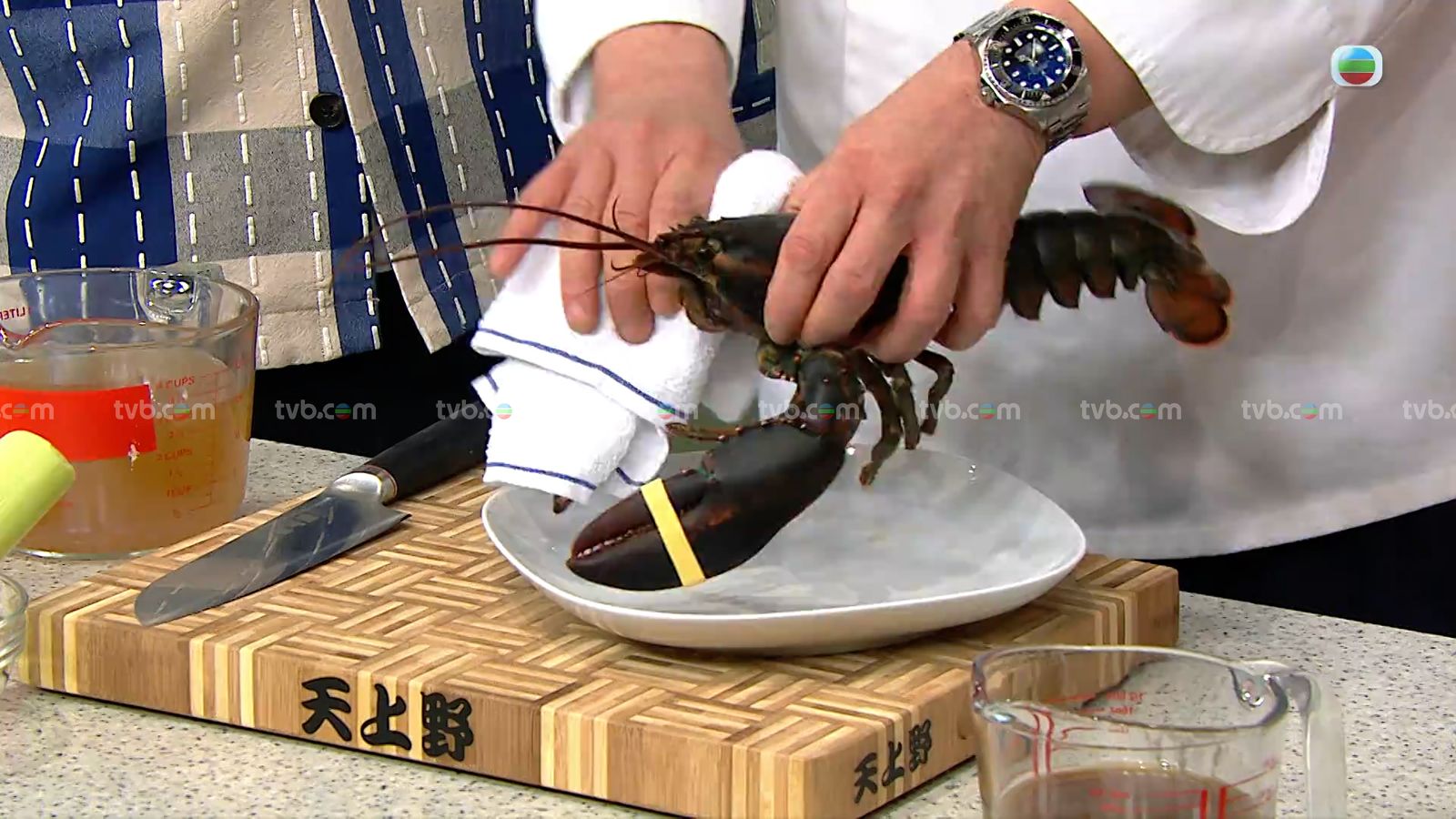Ken師傅第一次上節目,為大家帶來龍蝦與羊肚菌的傳統法餐組合。龍蝦拆鉗,蝦身沸水煮30秒後取出拆殼備用。蝦鉗浸熱水12分鐘後拆殼切碎。拆出的蝦殼留下,用來煮湯。