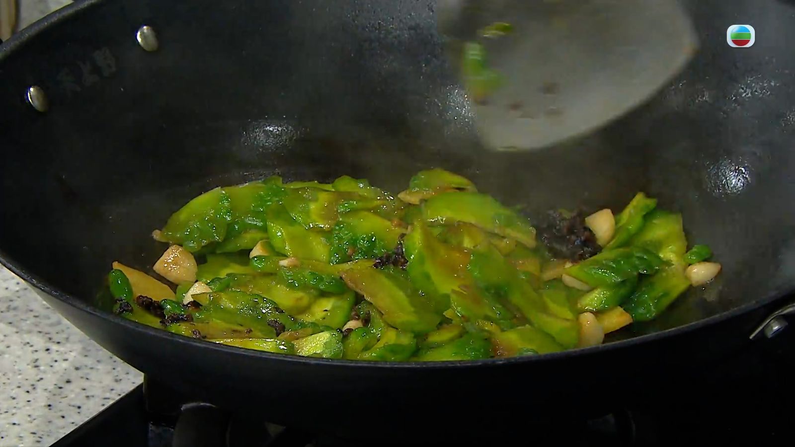 把蒜子、薑片下油鍋爆香,放入涼瓜片兜炒,然後注入清水,順序下砂糖、蠔油、生抽、豆豉炒勻。