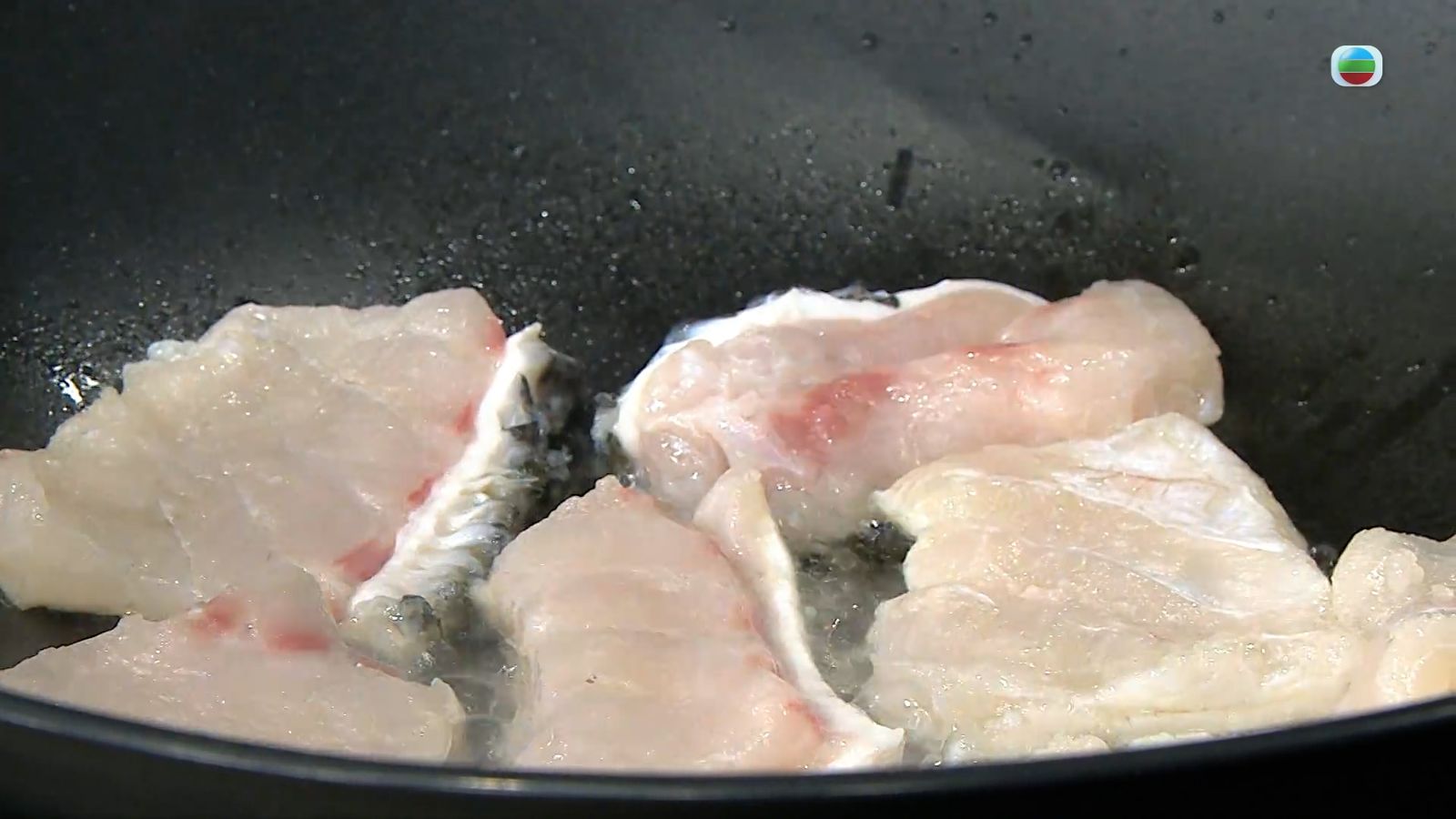龍躉肉切片,下鹽、生粉、油拌勻略醃,然後下油鍋煎香兩面,取出備用。