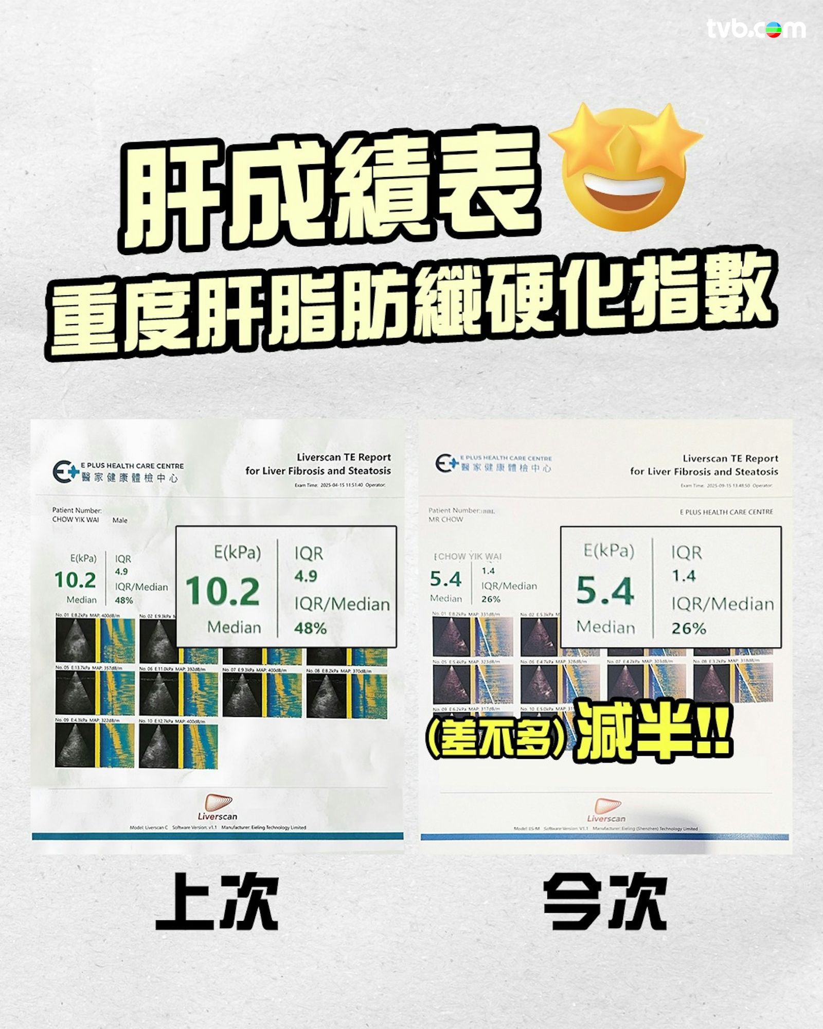 Jarvis早前自爆患上重度脂肪肝,脂肪指數一度高達395(dB/m),比重度脂肪肝標準高出約100(dB/m),而肝臟硬度及纖維化數值達10.2(kPa),超出正常範圍的2至6 kPa,情況令人憂慮。近日他於社交平台分享最新檢查結果,指經過約半年努力調養,肝臟硬度與纖維化指數幾乎減半至5.4(kPa),重回健康水平,脂肪肝指數亦持續下降,令他驚喜表示:「現場所有人包括我自己同姑娘都感到好振奮!」