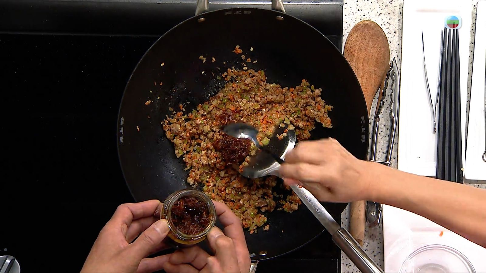 免治豬肉醃好之後起油鍋爆炒,先後加蒜蓉、蘿蔔粒和沙葛粒一起炒熟,加生抽和生粉水兜勻後再下芫荽碎及XO醬拌成十分下飯的餡料。