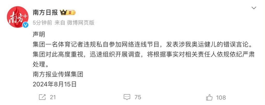 日前(14日),內地一體育記者朱小龍在直播中對全紅嬋發表不當言論,稱其「瘋瘋癲癲」、「不跳水以後像個白痴一樣」,引發內地網民的強烈不滿。該記者所屬公司於15日晚間對外發布聲明,指朱小龍違規私自參加網絡連線節目,並在節目中對奧運健兒全紅嬋發表錯誤言論,集團對此高度重視,迅速組織開展調查,將根據事實對相關責任人依規依紀嚴肅處理。而朱小龍本人亦已申請關閉微博賬號。