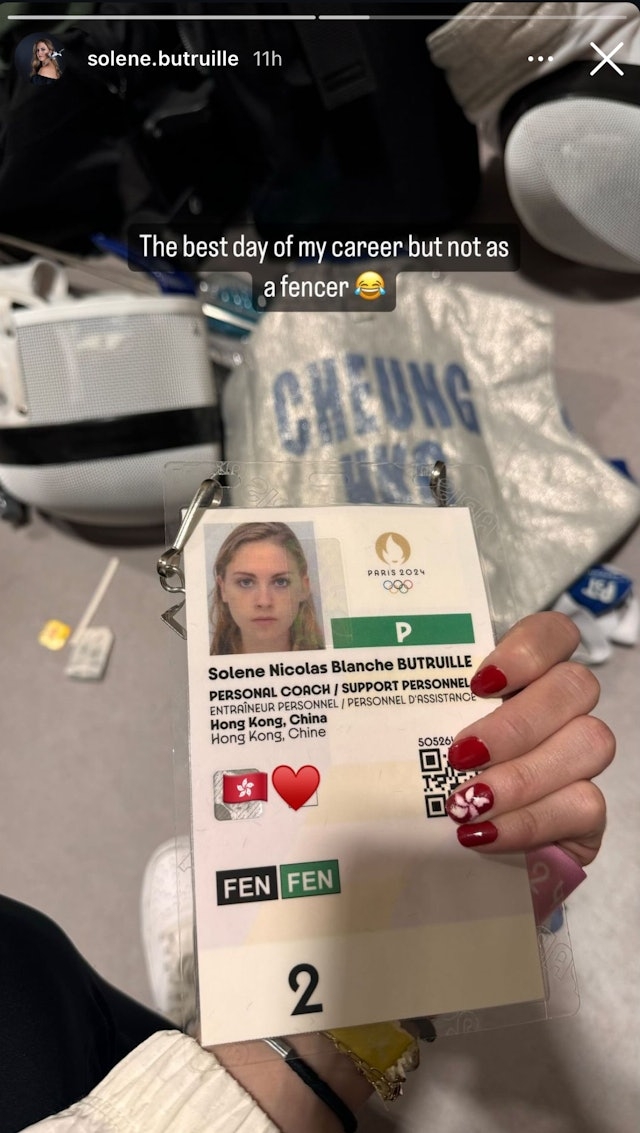原來這位「張家朗女友」Solène Butruille亦是一位劍手,本身是法籍運動員的她也曾代表國家參加過不少大賽,更拿過金牌!此次家朗在奪金後也率先轉發Solène Butruille的限時動態,可謂相當有「求生欲」!為家朗感到驕傲的Solène Butruille亦連出三個貼文恭賀家朗,其中一個貼文更讚家朗是「The Legend Ka Long(傳奇家朗)」。而今次奧運,張家朗女友都有同行,她轉發了一張奧運工作證,上面寫著她的崗位是「Personal Coach/ Support Personnel(個人教練/支援人員)」。雖然張家朗女友Solène Butruille是法國人,但工作證卻寫著「Hong Kong, China」,見她的指甲上更塗上了香港區徽圖案,張家朗女友寫道:「The best day of my career but no as a fencer(我職業上最好的一天,但並非以劍手身份)」而工作證的後方,更擺放著一件寫著「CHEUNG HKG」的比賽服和面罩,高調放閃。![]()